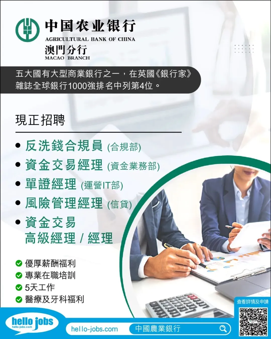 中國農業銀行是一家同時在上海、香港兩地掛牌上市的國有大型商業銀行,致力於建設經營特色明顯、服務高效便捷、功能齊全協同、價值創造能力突出的國際一流商業銀行集團。中國農業銀行在英國《銀行家》雜誌全球銀行1000強排名中列第4位。為配合中國農業銀行澳門分行的業務發展,誠邀有志於銀行業發展的精英加入我們之團隊,我們期待與您攜手共創輝煌。