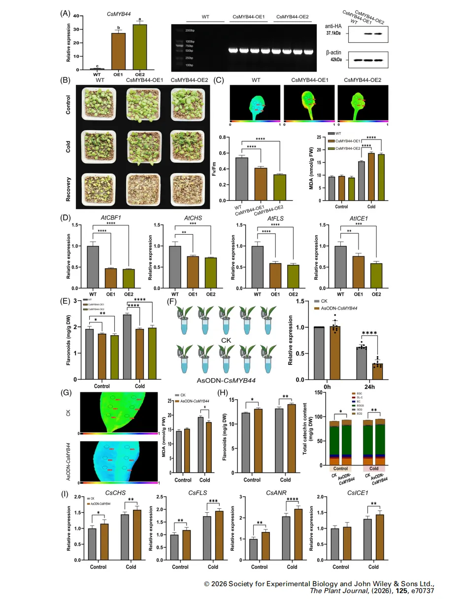 CsMYB44的过表达降低了拟南芥的耐寒性,而其沉默则增强了茶树的耐寒性。