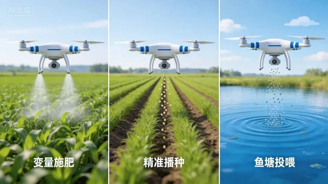 鱼塘投喂——清晨的鱼塘边,无人机吊起饵料箱,按设定航线自动投喂。不用担心人工投喂不均匀,更不用担心人掉进塘里。