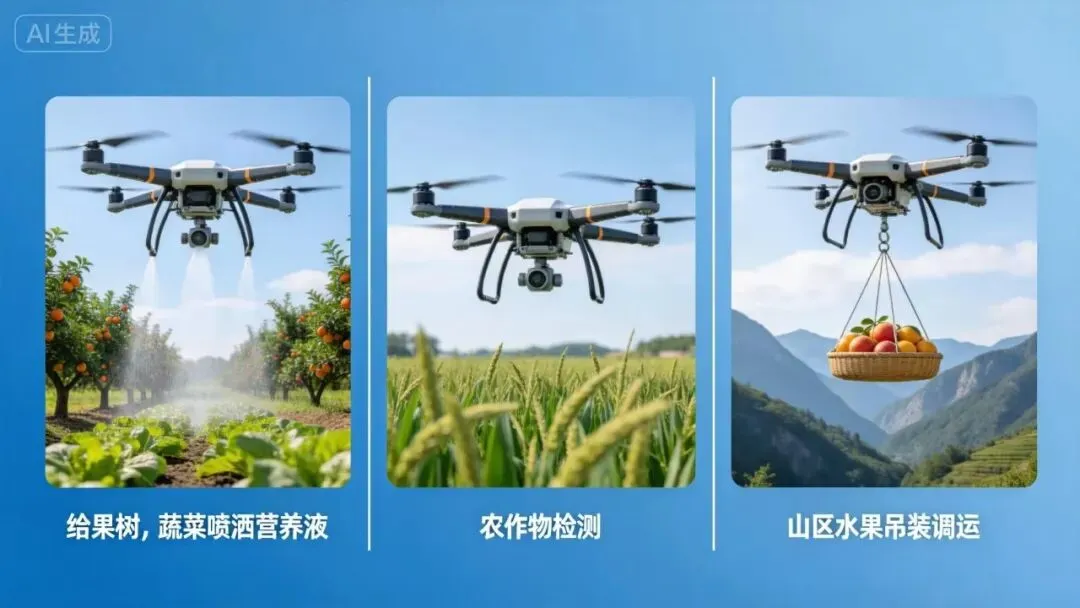 果树、蔬菜喷洒营养液——丘陵地带的果园,大型机械进不去,人工背药桶又累又危险。无人机从头顶掠过,叶片正反面都能均匀着液。