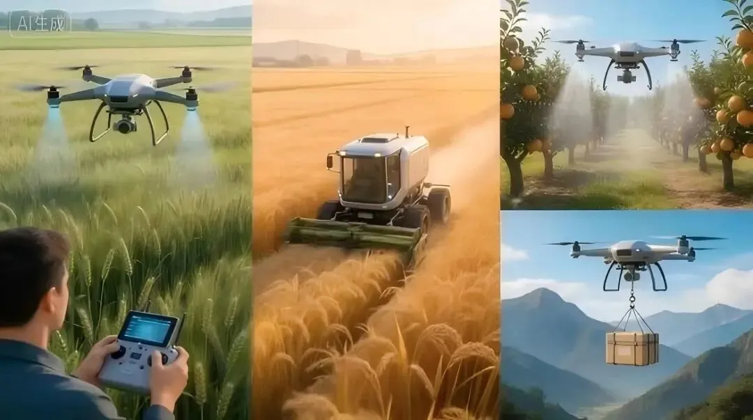 精准播种——水稻、油菜、小麦,无人机飞过,种子均匀入土。以前一个人一天撒不了几亩地,现在一台无人机一天作业数百亩。
