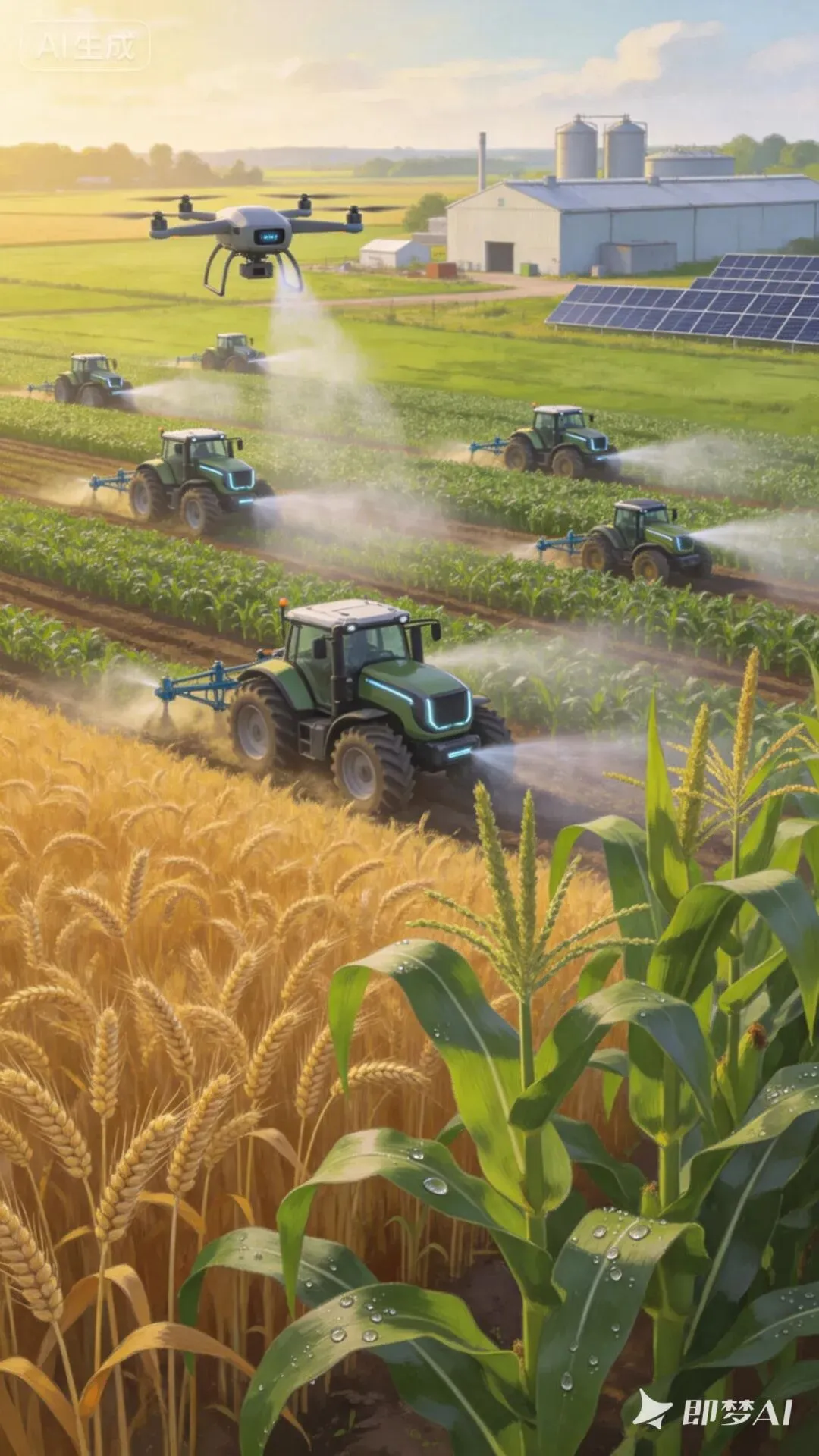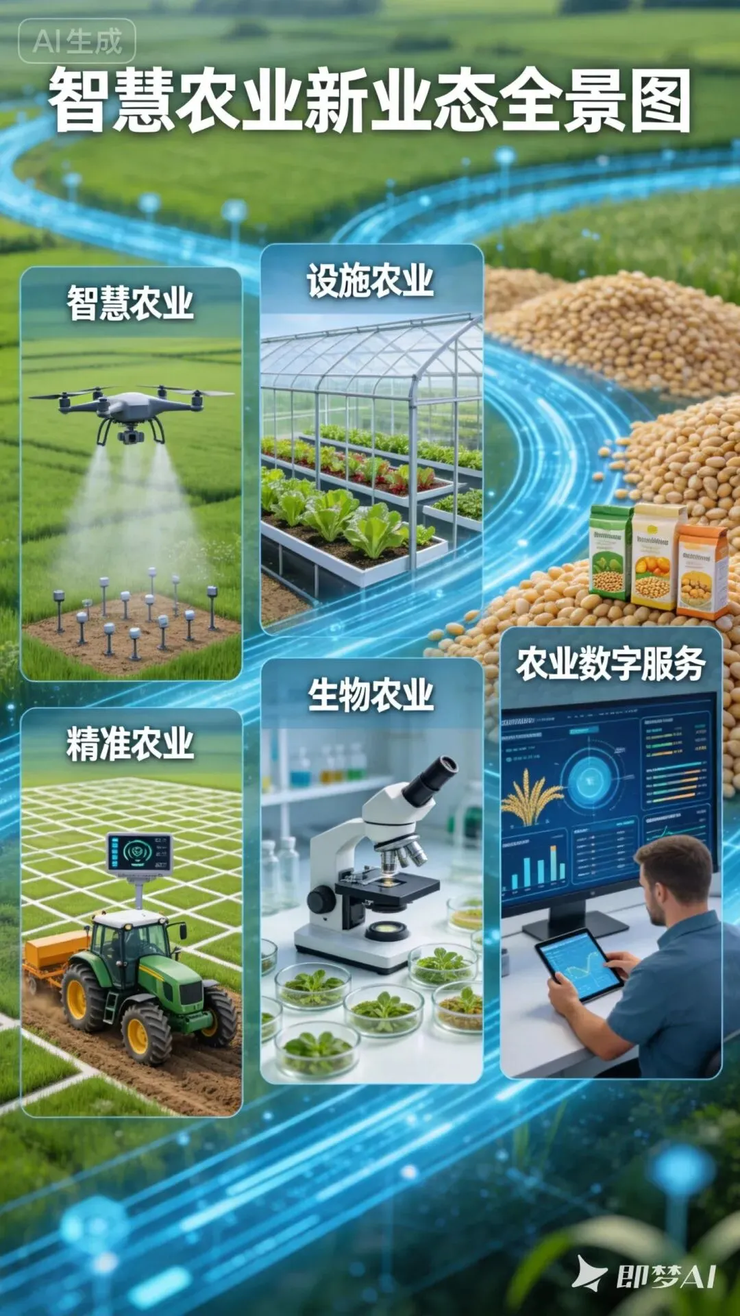 以生物育种、数字智能、绿色低碳等前沿技术为支撑:基因编辑育种、北斗无人农机、无人机植保、物联网监测、AI精准决策、设施农业、生物制造等,推动农业从经验驱动→数据驱动。
