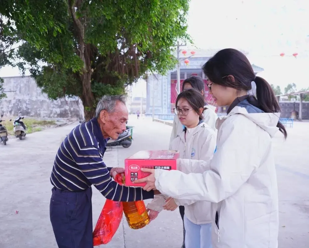 从课堂上的循循善诱到村落里的嘘寒问暖,华农麻演青稻队在守护儿童成长的同时,也将一份浓浓的关怀送进了村内高龄老人与困难家庭的心坎里。在2026年新春佳节即将到来之际,华农麻演青稻队积极响应麻演爱心基金会的号召,与麻演村委会、麻演青年志愿者协会共同开展“迎春送暖”慰问活动,为麻演村97位高龄老人和困难家庭送去花生油、面条、腐竹等年货。通过话家常、问冷暖,志愿者们详细了解群众需求并送上新春祝福。活动以实际行动弘扬了尊老爱幼的传统美德,营造了喜庆祥和的节日氛围,为“百千万工程”汇聚了来自社会各界的暖心力量。
