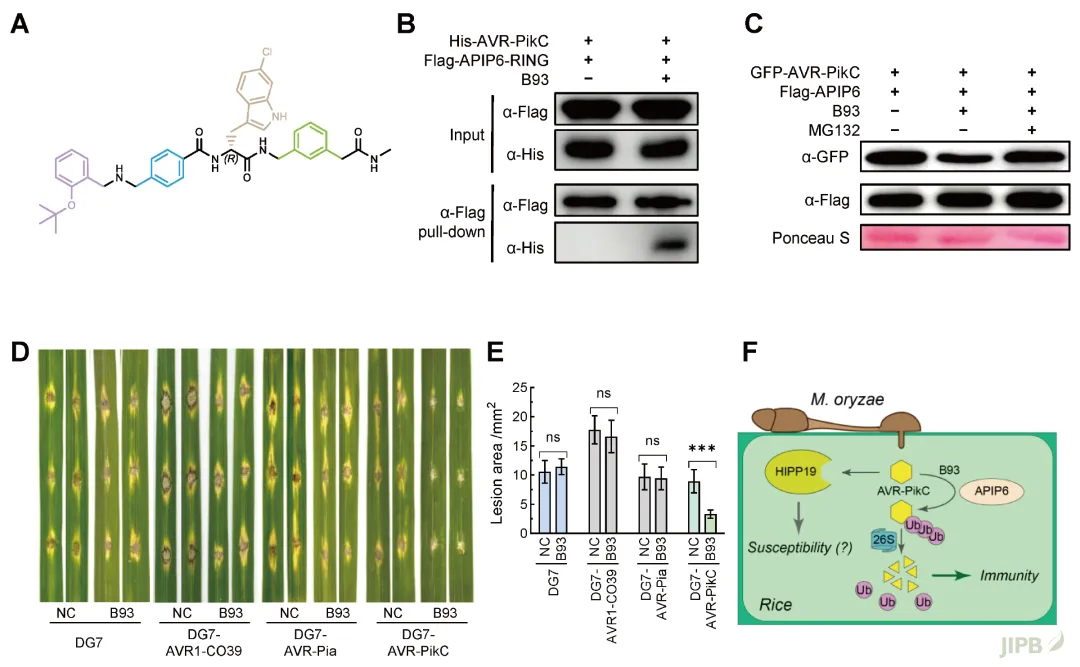该研究基于水稻——稻瘟菌的互作系统。APIP6是一种水稻胞内的E3泛素连接酶, 正调控水稻对稻瘟菌的免疫。AVR-PikC是一种在稻瘟菌生理小种中广泛存在的效应蛋白, 可进入水稻细胞, 但目前尚未发现可识别该蛋白的免疫受体。该研究通过DNA编码的化合物库, 筛选到小分子B93 (图1A)。体外的表面等离子共振和Pull-down实验表明, B93可同时与APIP6-RING (APIP6的RING结构域) 和AVR-PikC互作, 并可介导两种蛋白形成复合物; 体内的Co-IP和水稻接种实验表明, B93可介导AVR-PikC被蛋白酶体降解, 且能抑制含有AVR-PikC基因的稻瘟菌对含有APIP6基因的水稻的致病力 (图1B-E)。