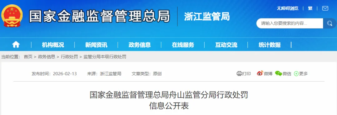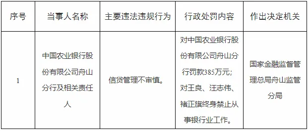 2026年2月13日,国家金融监督管理总局舟山监管分局正式对外发布行政处罚信息。中国农业银行股份有限公司舟山分行因信贷管理不审慎,被处以385万元罚款;与此同时,3名责任人被终身禁止从事银行业工作。