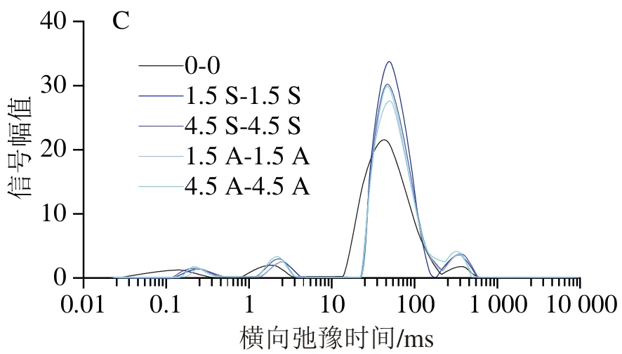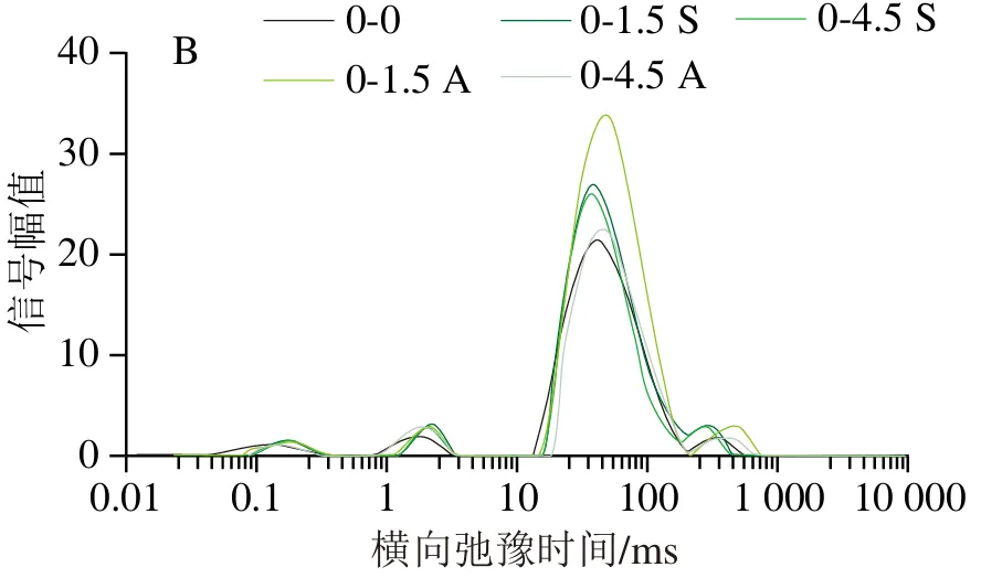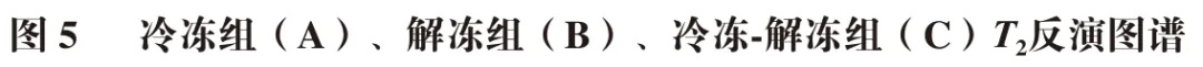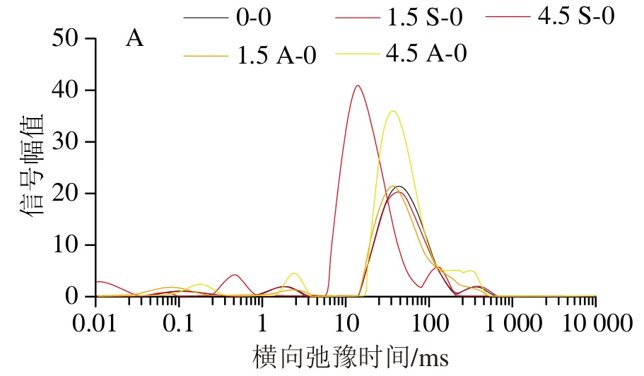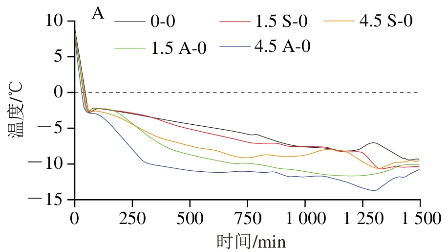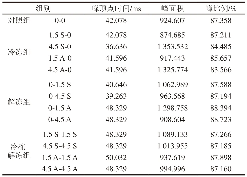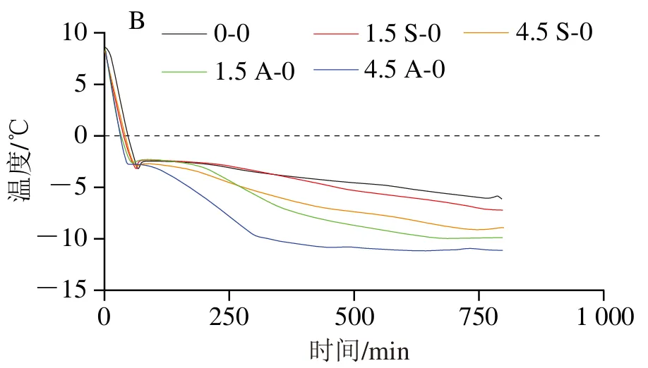 图1A冷冻曲线反映了在冷冻期间肉饼温度与时间的关系。结果显示,在冻结过程中,相同时间条件下,磁场辅助处理时调理肉饼的温度较无磁场辅助低,可以提高其冷冻速率。冷冻过程包括3 个阶段,分别为预冷阶段、相变阶段和过冷阶段。在相变阶段其温度曲线呈平缓趋势,温度区间大致为-5~0 ℃,可称为最大冰晶生成带。由图1B可知,肉饼的最大冰晶生成带的温度为-5~0 ℃,对照组通过最大冰晶生成带的时间为554 min,1.5 S-0、4.5 S-0、1.5 A-0、4.5 A-0的时间分别为425、232.5、235.5、137 min。结果显示4.5 mT交变磁场处理条件下肉饼通过最大冰晶生成带的时间最短,较对照组缩短了417 min。在冷冻过程中,越快通过最大冰晶生成带,生成的冰晶越为细小规则,对肉饼组织结构产生的机械损伤越小,肉饼的食用品质也越好,其冷冻效果最佳。该结论与Li Bing等的研究结果一致。
