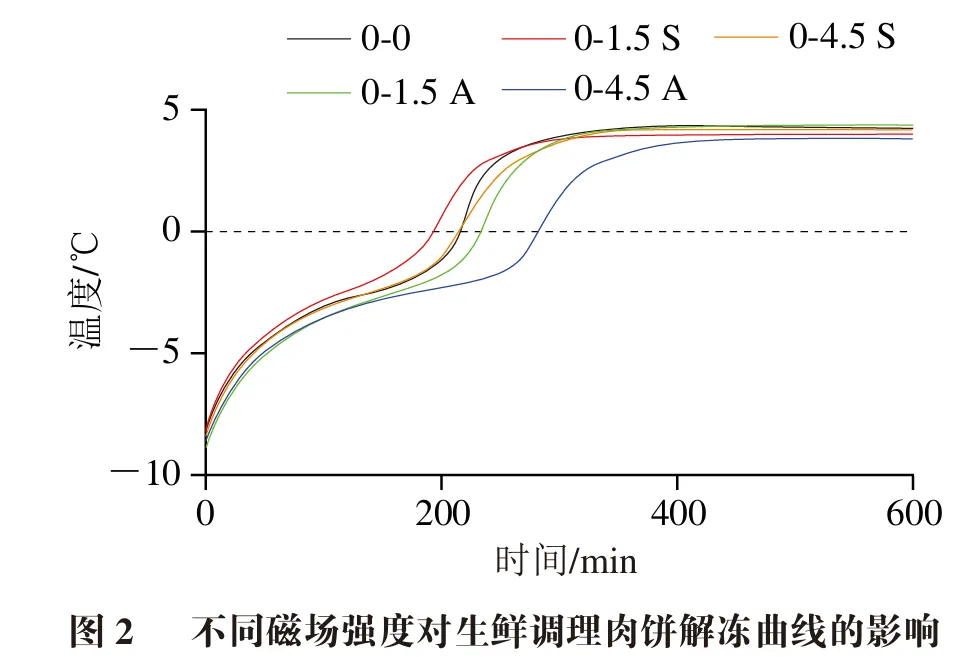 1 不同磁场强度对调理肉饼冷冻/解冻曲线的影响