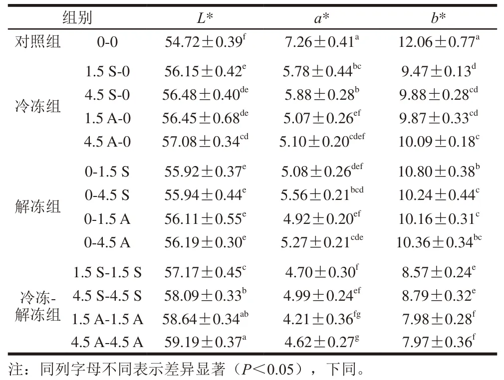 肉品的解冻损失可以反映其保水力。由图3可知,对照组的解冻损失为9.36%,在磁场辅助条件下,可以降低2.51%~5.58%的解冻损失(P<0.05)。在冷冻组和冷冻-解冻组,交变磁场辅助条件下肉饼的解冻损失低于静磁场辅助;在解冻组,交变磁场条件下的解冻损失高于静磁场辅助。其中,4.5 A-4.5 A条件下磁场辅助的肉饼的解冻损失最小,为3.78%,较对照组降低了59.62%,该结论与冷冻/解冻曲线所得结论一致,由于4.5 mT交变磁场条件下,肉饼的冷冻速率最快,生成的冰晶细小规则,对肉饼组织结构的机械损伤小;且肉饼的解冻速率最低,水分分布更均匀,与肉饼组织结构的结合更紧密,汁液损失较小。而对照组的解冻速率慢,蛋白质的变性程度提高,水分与组织之间的结合率降低,汁液流失率提高。因此,一定强度的磁场辅助可以提高调理肉饼的保水性。