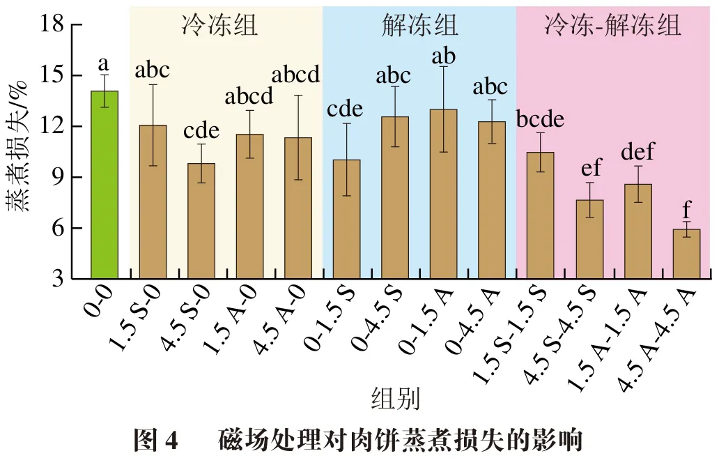 蒸煮损失表征经过冷冻-解冻的肉饼进行复热(75 ℃水浴加热)后,其汁液损失的程度,也是反映肉保水性的指标。由图4可知,磁场辅助相较于无磁场辅助,可以降低1.08%~8.17%的蒸煮损失。其中,对照组的蒸煮损失为14.07%,在冷冻-解冻组中4.5 mT交变磁场条件下,蒸煮损失为5.90%,较对照组降低了58.07%,降低效果显著(P<0.05)。该结论与冷冻/解冻曲线和解冻损失所得结论一致,4.5 mT交变磁场条件下肉饼的冷冻速率最快、冷冻终点温度较低、解冻速率最低。磁场辅助条件下,肉饼中的水分子与肌肉组织结合状态改变,水分的流动性降低,保水性较好。