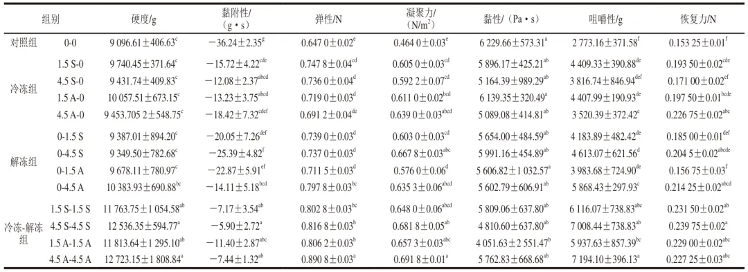 本实验对对照组和在不同磁场条件下冷冻、解冻、冷冻-解冻组的质构进行了分析,结果如表5所示。磁场辅助条件下冷冻组与解冻组的肉饼硬度与对照组(9 096.61 g)无显著性差异(P>0.05)。磁场辅助冷冻-解冻中4.5 S-4.5 S、4.5 A-4.5 A两组的硬度最大,与对照组相比有极显著差异(P<0.01),原因是对照组中肉饼的肌肉中组织结构被冰晶破坏,而磁场辅助条件下生成的冰晶小,破坏程度低。肉饼的黏附性为负值,其绝对值越大,说明黏附性越强,反之越小。磁场辅助条件下冷冻、解冻、冷冻-解冻组的黏附性均弱于对照组(-36.24 g·s),且具有显著性(P<0.05),其中,4.5 mT静磁场辅助冷冻-解冻后的肉饼黏附性最小(-5.90 g·s)。磁场辅助条件下各组的弹性和凝聚力有一定的提升,且具有显著性(P<0.05),其中4.5 mT的交变磁场辅助冷冻-解冻后的肉饼弹性和凝聚力效果最佳;由于生鲜调理肉饼不属于典型的流体或半流体,因此各实验组的黏性相较于对照组无显著性差异(P>0.05)。咀嚼性是肉饼硬度、弹性和黏附性的综合体现,一般来讲,数值越大,口感越好。冷冻组、解冻组、冷冻-解冻组各组的咀嚼性均显著(P<0.05)高于对照组(2 773.16 g)。磁场辅助冷冻-解冻后的肉饼咀嚼性提升较大,1.5 S-1.5 S、4.5 S-4.5 S、1.5 A-1.5 A、4.5 A-4.5 A的咀嚼性分别为6 116.07、7 008.44、5 937.63、7 194.10 g,相较于对照组有极显著差异(P<0.01);除了4.5 S-0、0-1.5 S和0-1.5 A以外,冷冻组、解冻组、冷冻-解冻组的各组恢复力均显著(P<0.05)高于对照组(0.153 25 N),冷冻-解冻组中各组的恢复力相较于对照组均有极显著差异(P<0.01)。综合以上,磁场辅助可以改善调理肉饼的品质,其中4.5 mT的静磁场和交变磁场条件下肉饼的质构特性最佳。