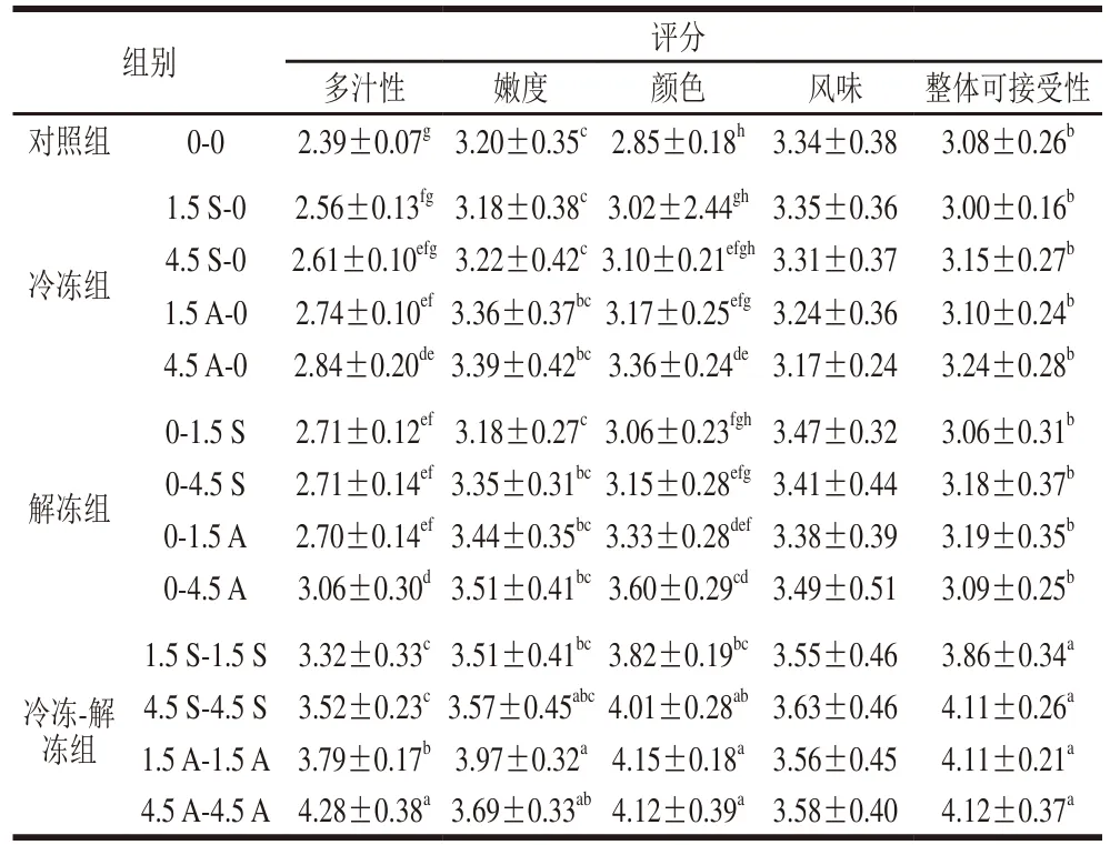 肉制品的感官特性涵盖颜色、硬度、湿润度以及风味口感等方面。通过表6可知,与对照组(2.39 分)相比,磁场辅助冷冻、解冻、冷冻-解冻可以显著(P<0.05)提高生鲜调理肉饼的多汁性,其中使用4.5 mT交变磁场辅助冷冻-解冻(4.28 分)后的肉饼最为多汁,原因是磁场辅助过程中,冷冻时生成的冰晶较为细小规则,肉饼组织结构的损伤较小,解冻后水分的结合强度较高、分布均匀。磁场辅助冷冻-解冻后的肉饼颜色显著(P<0.05)优于对照组(2.85 分),原因是磁场作使肉饼的亮度提高,红度与黄度下降,使肉饼呈现出诱人的肉色,该结论与表1所示结果一致。1.5 mT交变磁场辅助冷冻-解冻(3.97 分)后的肉饼嫩度较高,其他磁场处理条件下的肉饼嫩度与对照组变化不大(P>0.05)。磁场辅助对于改善肉饼的风味无明显作用(P>0.05)。综合而言,磁场辅助冷冻-解冻后的肉饼整体可接受性显著(P<0.05)提高,仅使用磁场辅助冷冻/解冻后的肉饼相较于对照组,可接受性无显著差异(P>0.05)。以上结果表明,磁场辅助冷冻-解冻对于改善生鲜调理肉制品的多汁性与色泽有一定作用。
