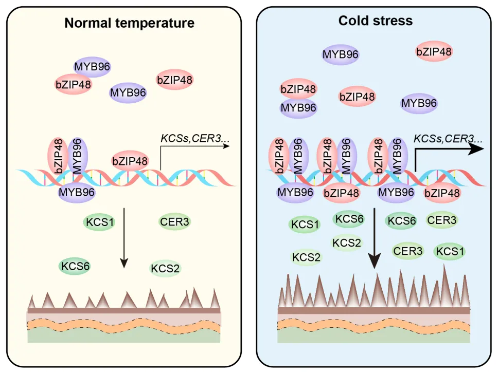 该研究揭示长期的冷胁迫可以诱导拟南芥蜡质合成基因KCSs和CERs的上调表达,促进蜡质的合成和积累,从而增强植物的冷冻胁迫耐受性。该研究进一步发现,转录因子MYB96受冷胁迫诱导上调,负责冷胁迫下的KCSs和CER3基因的激活,以促进冷胁迫下的蜡合成,从而增强植物的抗冻性。此外,研究团队还发现bZIP48与MYB96互作。bZIP48也受冷胁迫诱导上调,并且通过直接激活KCSs和CER3基因正向调节蜡质合成,以增强抗冻性。有趣的是,bZIP48与MYB96之间的相互作用增强了彼此的DNA结合活性,从而协同调控低温胁迫下蜡质的生物合成,提高植物的抗冻性。