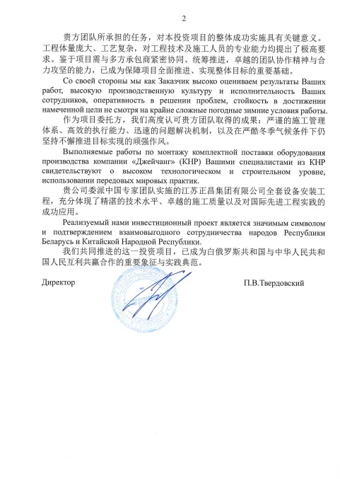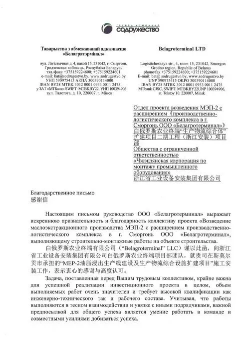 感谢信中特别强调:“我们携手推进的这一投资项目,已成为白俄罗斯共和国与中华人民共和国互利共赢合作的重要象征与实践典范。”项目实施全过程中,浙江安装团队秉持严谨务实的工作作风、坚守高度的责任担当,充分发挥出色的跨文化沟通与协同协作能力,在高质量推进工程建设的同时,以专业、诚信、高效的风范赢得白方合作伙伴的深度信赖与广泛赞誉,为中白两国在农业基础设施、智慧物流等领域的产能合作注入新活力、搭建新桥梁,成为深化中白全天候全面战略伙伴关系的生动注脚。