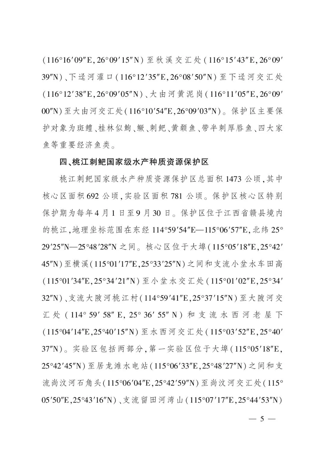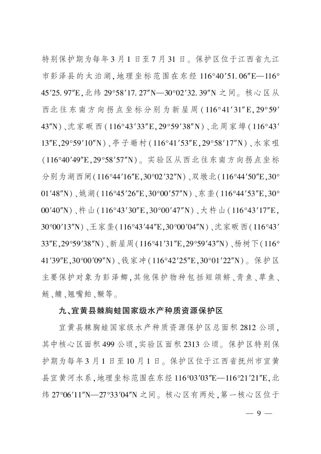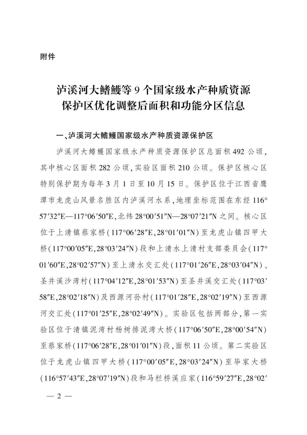 根据《中华人民共和国渔业法》《长江水生生物保护管理规定》《水产种质资源保护区管理暂行办法》《国家级水产种质资源保护区边界确定技术审查要点》等有关要求,江西省农业农村厅向农业农村部申请对泸溪河大鳍鱯等9个国家级水产种质资源保护区进行优化调整,主要是根据原有公告范围重新核算面积和规范保护物种名称。经审查,农业农村部同意对泸溪河大鳍鱯等9个国家级水产种质资源保护区进行调整,优化调整后的保护区面积范围和功能分区等详见附件。
