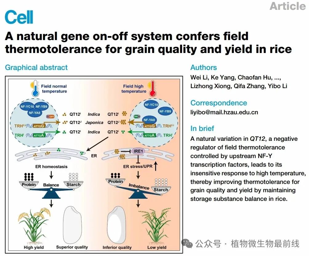 2025年4月30日,国际期刊《细胞》(Cell)发表了华中农业大学作物遗传改良全国重点实验室、生命科学技术学院、湖北洪山实验室水稻团队李一博教授课题组题为“一个天然的基因开关系统协同赋予水稻品质和产量田间耐热性”(A natural gene on-off system confers field thermotolerance for grain quality and yield in rice)的研究论文。