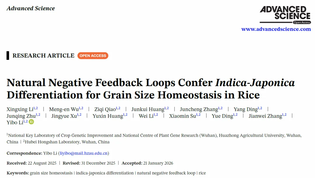 2026年2月5日,华中农业大学作物遗传改良全国重点实验室、生命科学技术学院、洪山实验室水稻团队李一博教授课题组在国际期刊Advanced Science发表了题为“Natural negative feedback loops confer indica-japonica differentiation for grain size homeostasis in rice”的研究论文。该研究通过全基因组关联分析(GWAS),鉴定了三个控制水稻粒长变异的关键基因及其自然等位变异,并系统阐明了由OsGRX8-(OsbZIP47)-OsbZIP08-OsGRX8构成的负反馈回路通过调节OsGRX8的表达,以维持籼稻和粳稻亚种间种子大小稳态的分子机制。该负反馈环形成的自我调控单倍型(SRHs),显示出独特的地理分布、籼粳分化和水稻籽粒性状及产量的差异,对水稻产量和籽粒性状的遗传贡献远高于单个组分各自单独的贡献。基于关键SRHs可实现水稻粒长和产量的定向改良,为水稻育种提供了一种新的策略,也为解析籼粳性状差异及禾谷类作物育种研究提供了理论依据。