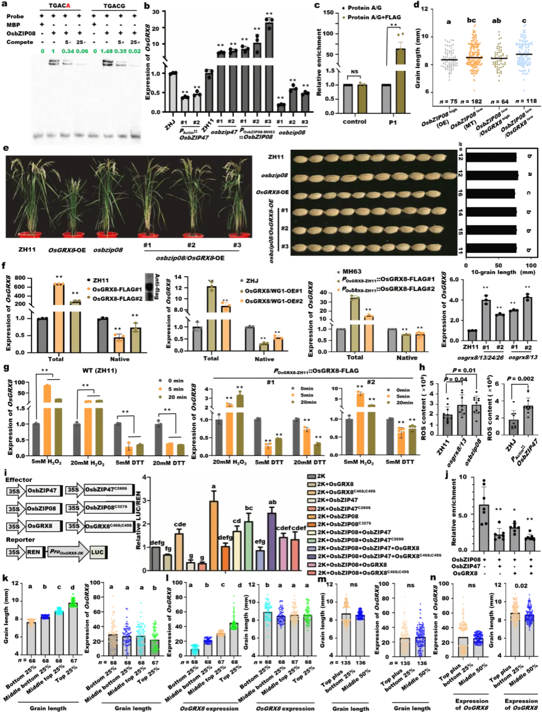 图1 OsGRX8-(OsbZIP47)-OsbZIP08负反馈环调控OsGRX8的表达以维持水稻种子大小稳态