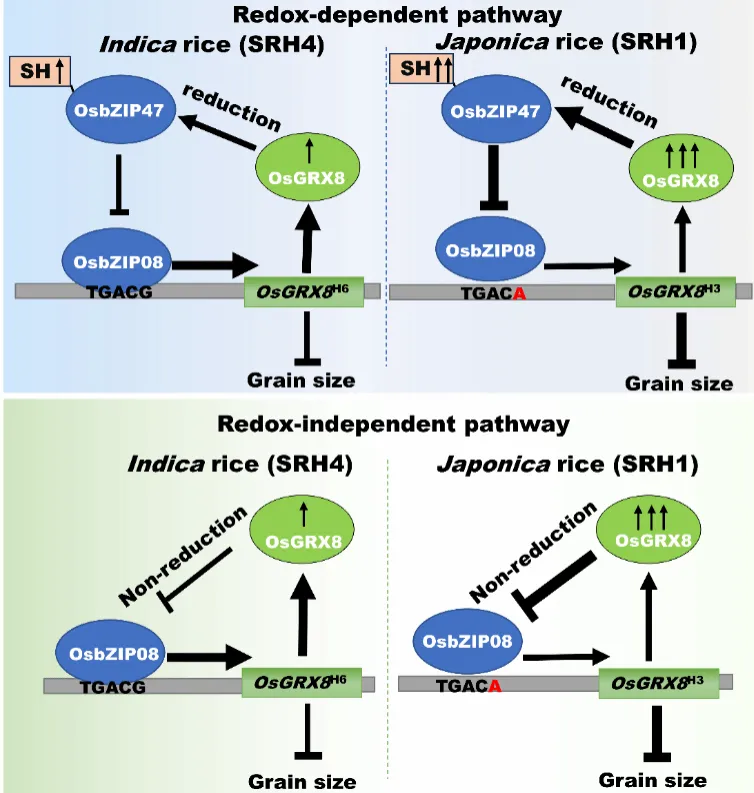 本研究更进一步将OsGRX8-(OsbZIP47)-OsbZIP08-OsGRX8负反馈调节机制与籼粳亚种分化直接关联。单倍型SRH1(粳型)和单倍型SRH4(籼型)单倍型通过精细调控OsGRX8的表达表现为不同的粒长,并解析籼粳稻种子大小分化的核心调控环路(图2)。在籽粒细长的籼稻品种中,OsbZIP08转录因子紧密结合在OsGRX8H6的TGACG基序上促进其表达;同时,低水平的OsGRX8蛋白量通过OsGRX8-(OsbZIP47)-OsbZIP08-OsGRX8负反馈环诱导OsGRX8H6的表达。而在籽粒短宽的粳稻中,OsbZIP08弱结合OsGRX8H3的TGACA基序并促进其少量表达;此外,高水平的OsGRX8蛋白量通过OsGRX8-(OsbZIP47)-OsbZIP08-OsGRX8负反馈环抑制OsGRX8H3的表达。