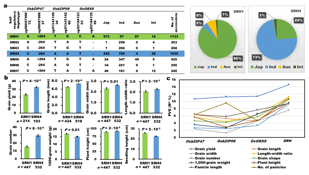 研究首次提出“自我调控单倍型”(SRHs)概念,即多个在功能上相互调控的基因,其功能变异在自然群体中以特定组合形式被共同选择和遗传而形成的单倍型组合(图3a)。由OsGRX8-(OsbZIP47)-OsbZIP08-OsGRX8负反馈环形成的自我调控单倍型(SRHs),不仅具有鲜明的地理分布与籼粳分化特征,且对籽粒性状(粒长、粒宽)和产量性状的协同遗传贡献率,显著高于单个基因的贡献(图3)。