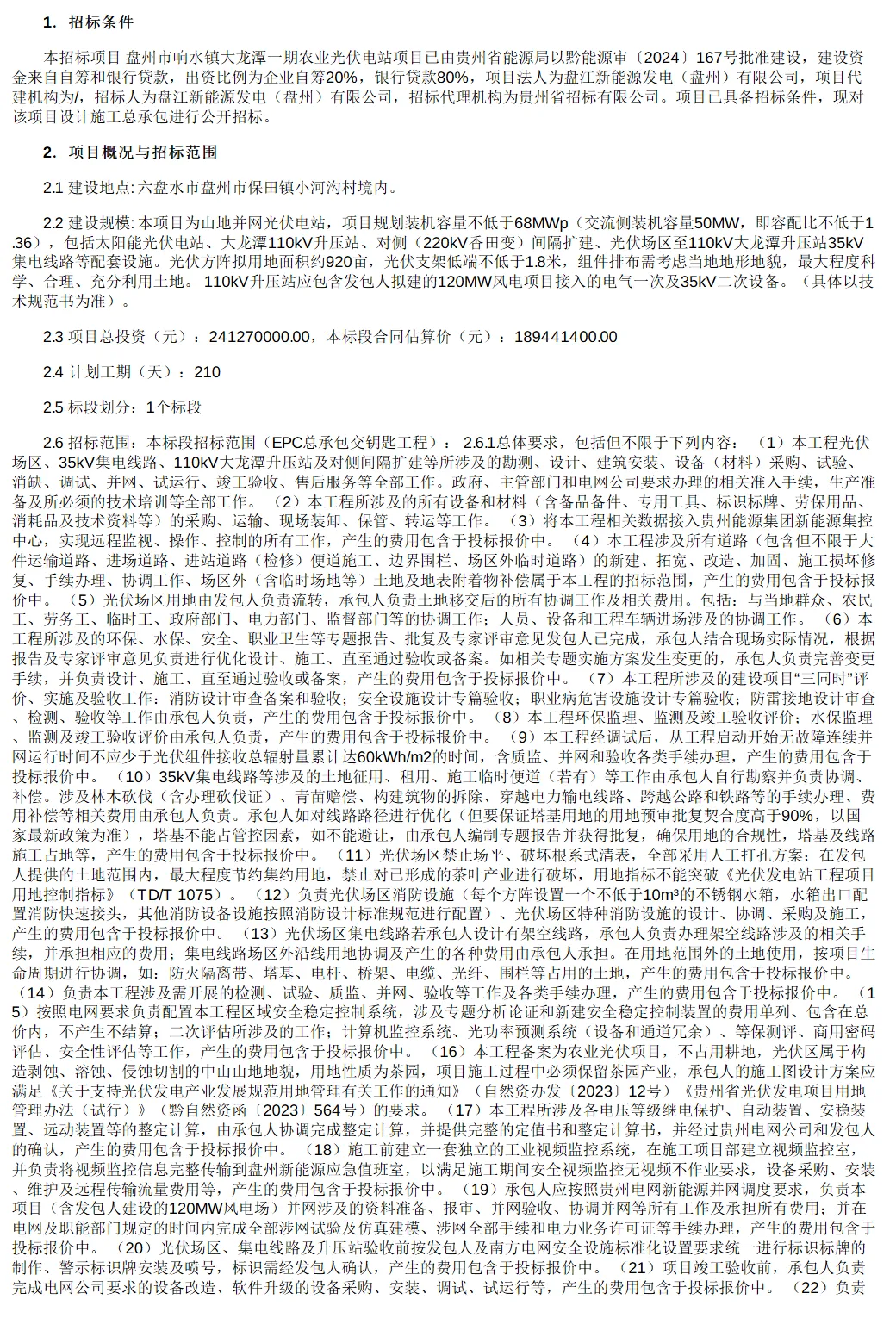 近日,贵州【盘州市响水镇大龙潭一期农业光伏电站EPC总承包工程】发布招标公告。