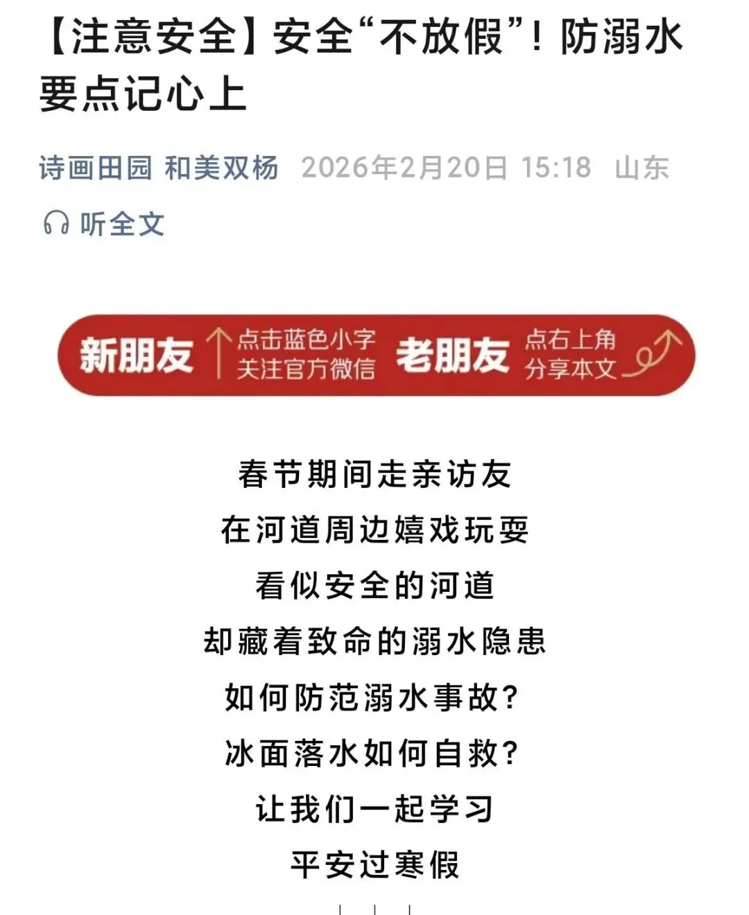 坚持“巡查+宣传”同步推进,把安全知识送到群众身边。值守过程中,对靠近水面玩耍的群众尤其是未成年人,及时上前劝阻,现场普及防溺水安全知识和科学自救、施救方法。充分利用公告栏、微信群、公众号等渠道,持续推送春节期间冬季防溺水温馨提示,多维度、全方位开展宣传教育,引导群众提高安全防范意识,让安全理念深入人心。