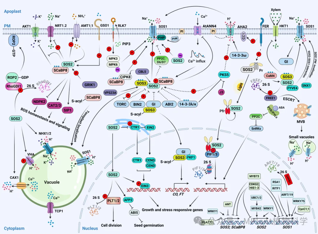 3. 钠离子转运及区隔化:在组织尺度上,通过SOS1介导根际排钠、HKT1介导木质部钠离子卸载等过程协同作用,精准控制钠离子向地上部的运输;在细胞尺度上,液泡膜NHX型转运蛋白可将钠离子区隔化储存以降低细胞毒性,且SOS通路组分可直接参与该过程的调控。此外,囊泡运输等机制还能动态调节SOS1等关键蛋白的亚细胞定位与丰度,从而实现快速而精确的胁迫响应。