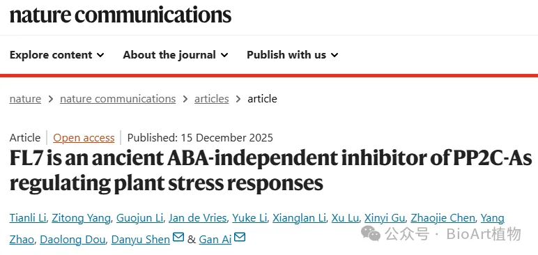 最近,南京农业大学窦道龙课题组在Nature Communications期刊上发表了题为FL7 Is an Ancient ABA-Independent Inhibitor of PP2C-As Regulating Plant Stress Responses的研究论文。该研究发现了一个古老的PP2C-A蛋白磷酸酶抑制子——FL7(Forked like 7)。该蛋白能够以不依赖ABA的方式广泛抑制PP2C-A活性,从而正向调控植物对渗透胁迫的适应能力并增强其免疫反应。这一发现揭示了在传统ABA信号通路之外存在的PP2C-A调控机制,为理解植物如何协同应对生物与非生物胁迫提供了新的视角。这项研究为未来的作物抗逆育种提供了新的基因资源和策略方向。