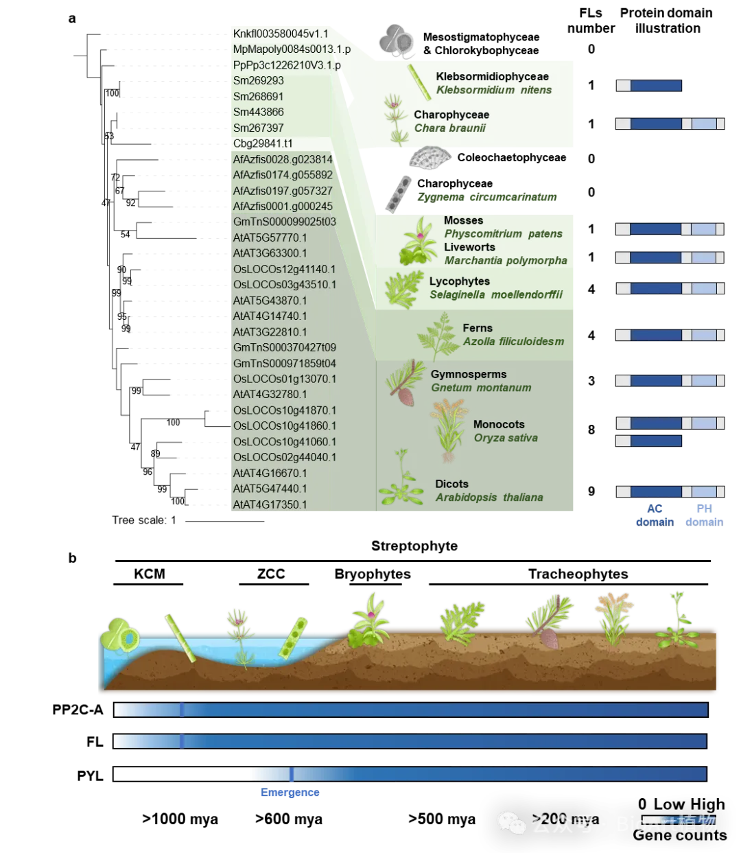 为探索FL7的进化起源,研究人员对17个代表性植物物种进行了比较基因组和系统发育分析。结果表明,FL7同源基因最早出现于链型藻类中的Klebsormidiophyceae与Charophyceae类群,并在维管植物中发生明显扩张(图1a)。功能保守性分析表明,这些藻类来源的FL7同源物在功能上与拟南芥FL7高度相似,这表明该蛋白家族在绿色植物进化过程中具有高度的功能保守性。这项研究不仅系统揭示了FL7在植物逆境应答中的核心作用,还表明其功能在植物从水生向陆生进化过程中被长期保留(图1b),为理解植物如何适应复杂多变的陆地环境提供了重要的分子进化依据。