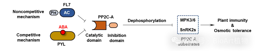 FL7通过其N端的生长素运输(Auxin canalization, AC)结构域,直接结合PP2C-A的C端磷酸酶结构域,从而有效抑制PP2C-A的活性。与典型ABA依赖的PP2C-A抑制剂PYLs不同,FL7以ABA非依赖的方式发挥作用,实现对磷酸酶活性的独立调控。通过抑制PP2C-A,FL7显著提升了植物对渗透胁迫的耐受能力,并同步增强了植物的免疫反应,使其在高盐环境中依然保持较强的抗病性。