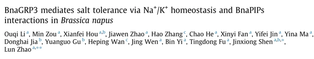 近日,华中农业大学作物遗传改良全国重点实验室油菜遗传改良创新团队沈金雄/赵伦课题组在国际学术期刊Journal of Advanced Research发表了题为 “BnaGRP3 mediates salt tolerance via Na+/K+homeostasis and BnaPIPs interactions in Brassica napus”的研究论文。该研究系统阐明了BnaGRP3通过维持Na⁺/K⁺稳态并与水通道蛋白BnaPIPs直接互作增强油菜耐盐性的分子机制,首次将GRP蛋白纳入盐胁迫调控核心网络,为耐盐碱油菜育种提供了关键基因资源和理论指导。