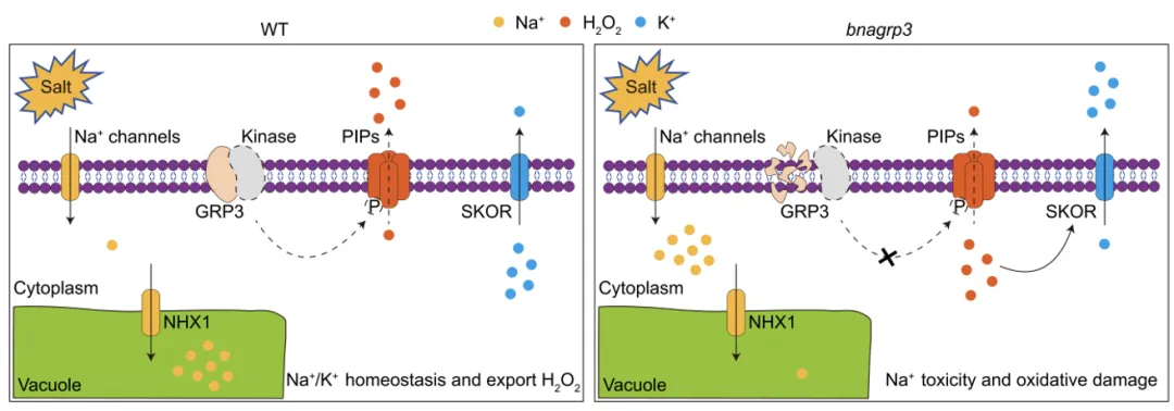 在盐胁迫条件下,野生型(WT)植株中,NHX1和SKOR协同维持较低的细胞质Na⁺水平和较高的K⁺水平,从而保持Na⁺/K⁺稳态。同时,BnaGRP3可能与未知激酶形成复合体,促进BnaPIPs的磷酸化,增强H₂O₂外排能力,维持细胞氧化还原平衡。相比之下,在bnagrp3突变体中,NHX1功能受损导致细胞质Na⁺积累,而BnaPIPs磷酸化水平下降引起H₂O₂异常积累并诱发氧化损伤。升高的H₂O₂进一步促进SKOR介导的K⁺外排,最终加剧盐胁迫条件下的离子稳态失衡。
