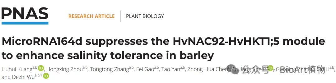 近日,湖南农业大学/岳麓山实验室吴德志团队在国际著名学术期刊PNAS在线发表题为MicroRNA164d suppresses the HvNAC92-HvHKT1;5 module to enhance salinity tolerance in barley的研究论文。该研究揭示了miR164d作为一个“分子刹车”精准调控HvNAC92-HvHKT1;5模块,实现耐盐作物大麦在盐胁迫下的“自救”模式,为阐明禾本科作物HKT1;5功能分化提供重要理论参考。