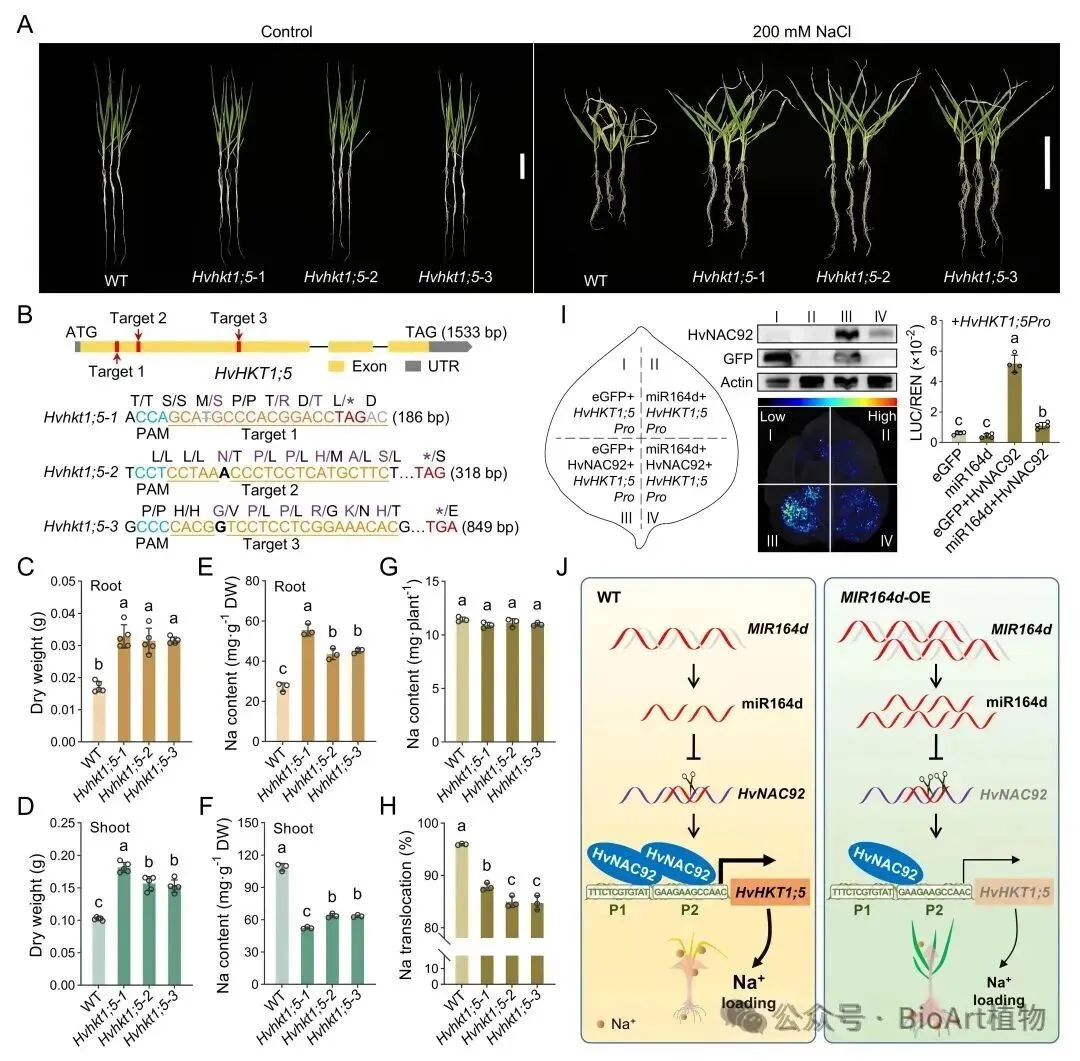 图3. miR164d-HvNAC92-HvHKT1;5模块精准调控大麦耐盐性