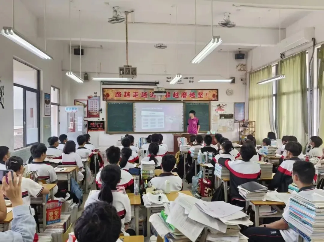 2月5日,杨博杰作为招生宣传大使,带领团队成员石一诺、吕浩阳、吴咚琳回到母校茂名市第一中学,以“走进华农,预见未来”为主题,采用“进班宣讲+校园摆摊+讲座宣传”相结合的形式,开展了一场生动的寒招活动。