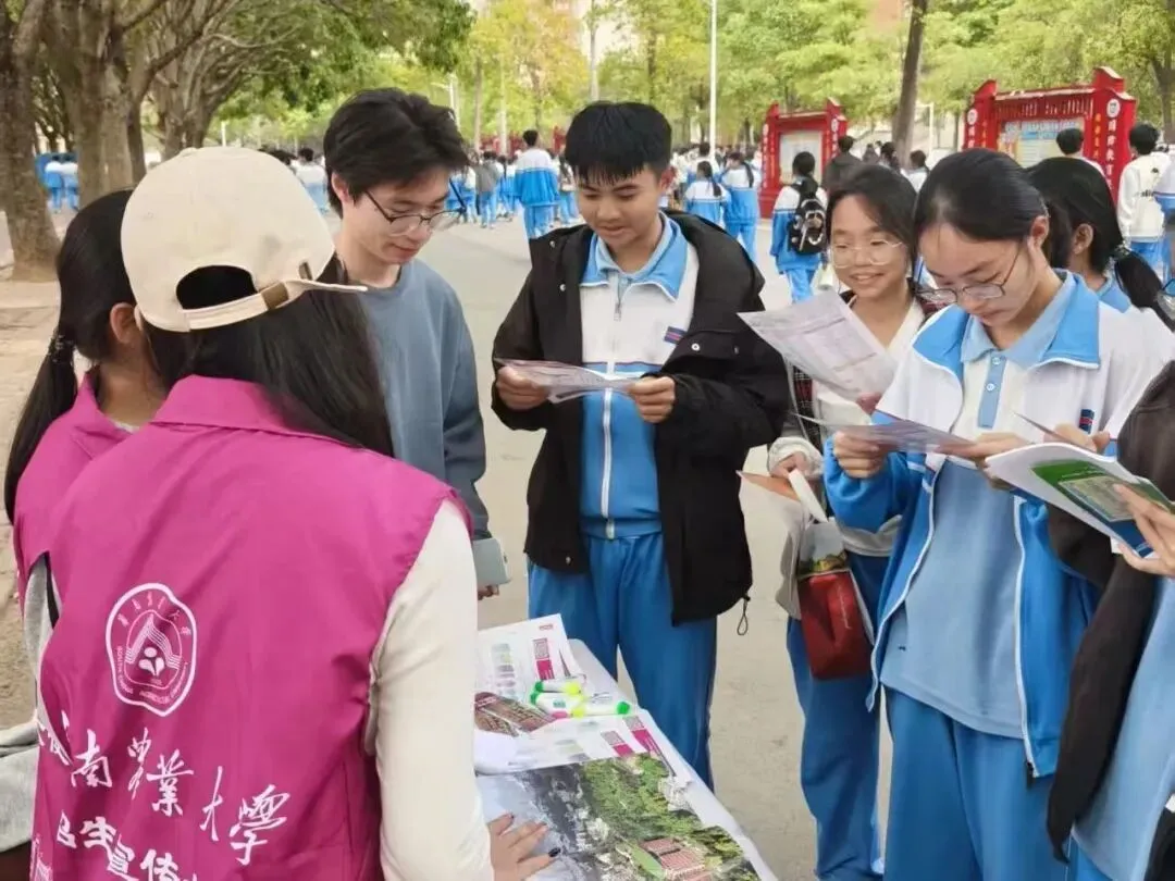 进班宣讲环节,团队从华农历史底蕴、学科优势、校园文化生活到历年录取分数线、报考注意事项等方面,进行了系统的讲解。宣讲现场,团队不仅介绍了华农作为国家“双一流”建设高校的深厚底蕴,还重点展示了国家级一流本科专业建设点的学科实力,并结合人工智能、智慧农业等前沿方向,解读了特色人才培养模式。校园摆摊环节,团队在校园内设置了咨询点,摆放了专业介绍手册及华农文创纪念品。学弟学妹们咨询踊跃,互动热烈,纷纷就自己关心的问题进行提问。团队成员们结合自身就读体验,耐心细致地解答了“如何平衡备考与目标规划”“华农各专业学习方向”等问题,分享了备考心得与大学生活的真实感受,为他们的升学规划提供了切实参考。