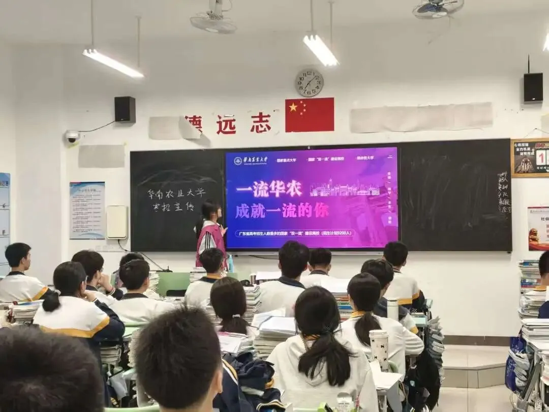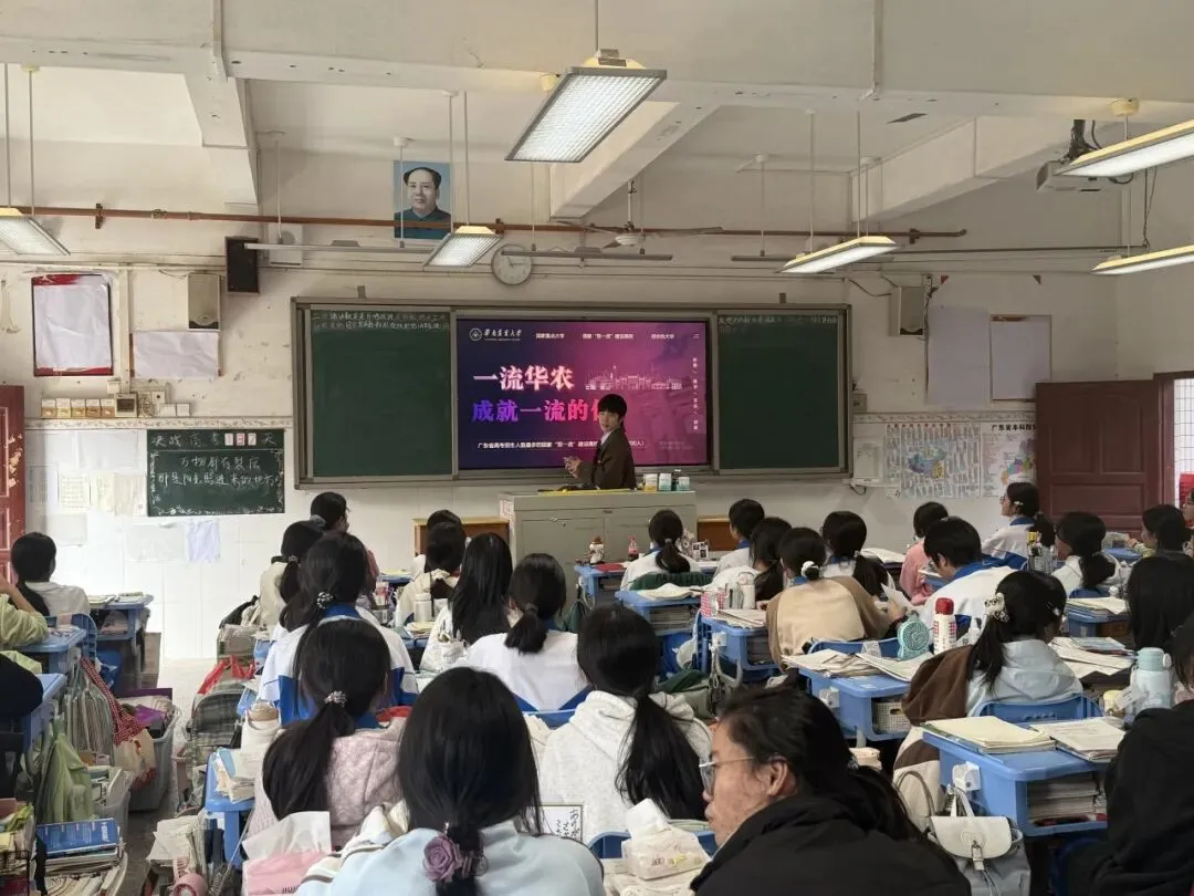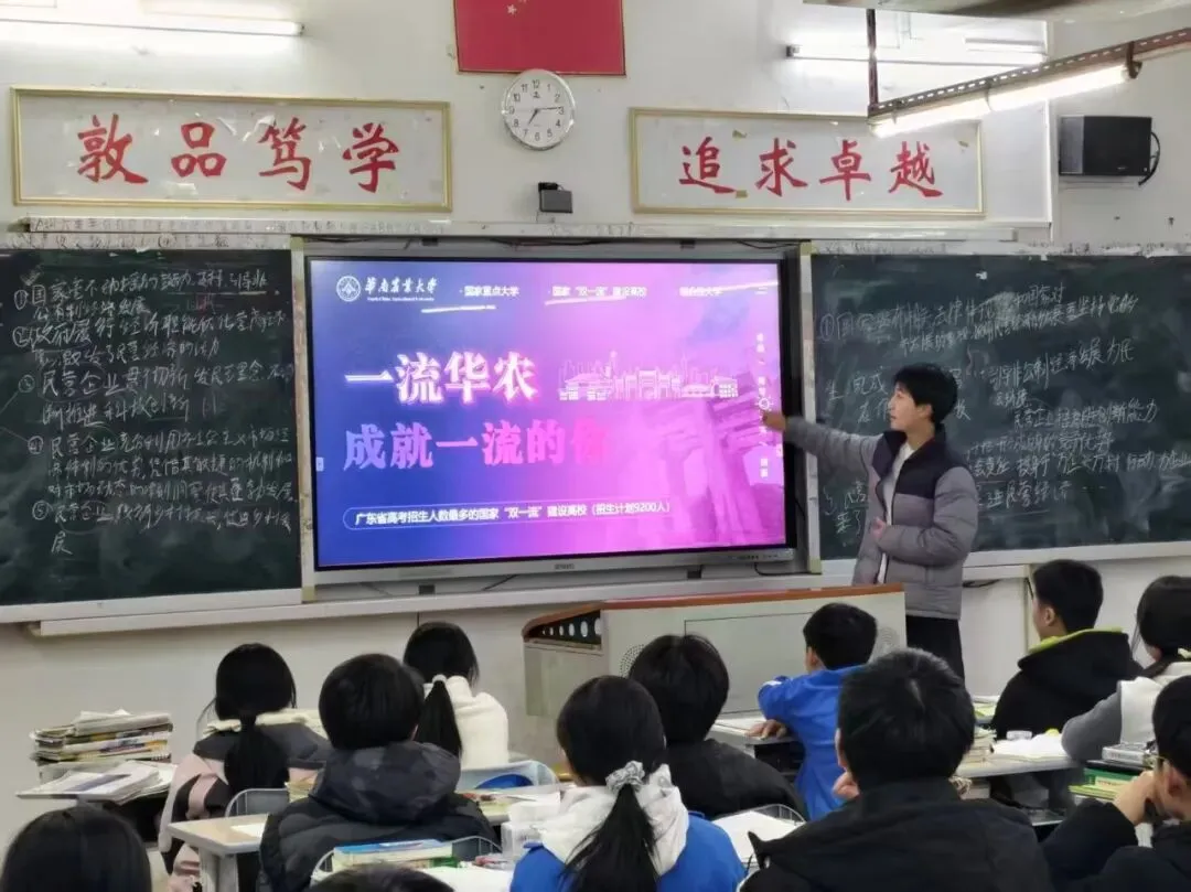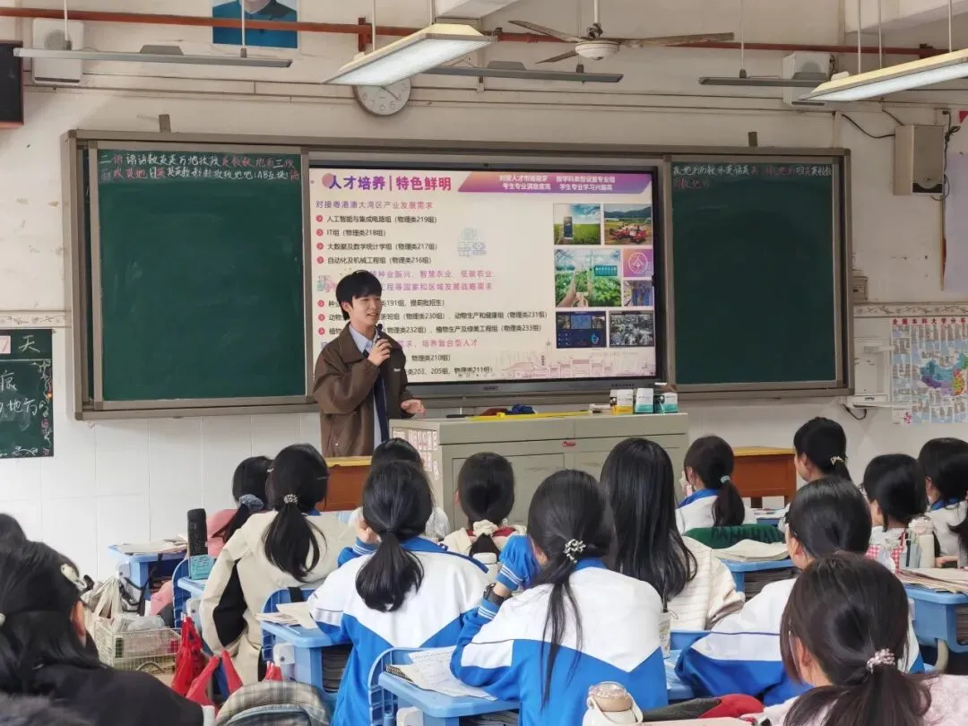 1月26日,陈舒怀作为招生宣传大使,与团队成员陈思诗一起回到母校华南师范大学附属电白学校,开展线下寒招宣传活动。团队采用“进班宣讲”与“校园摆摊”的形式,从华农历史底蕴中的毛主席亲笔题字、学科优势(如“双一流学科”作物学)、特色专业、校园文化生活、食宿环境(如六大食堂),到历年录取分数线、报考注意事项等方面,向学弟学妹们展开详细介绍。