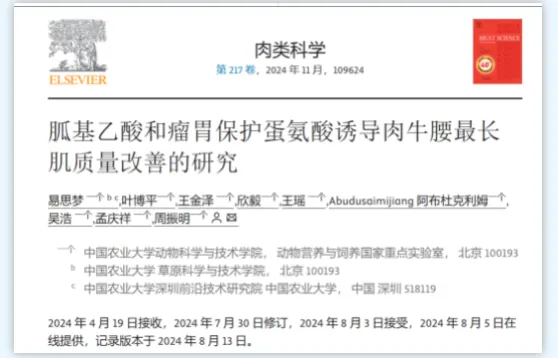 今天就给大家带来科学育肥方案:中国农业大学周振明教授团队的研究成果,2024年11月登上国际著名期刊《肉类科学》,专门揭秘胍基乙酸(GAA)+过瘤胃蛋氨酸(RPM) 复配使用对牛肉品质的改善作用!