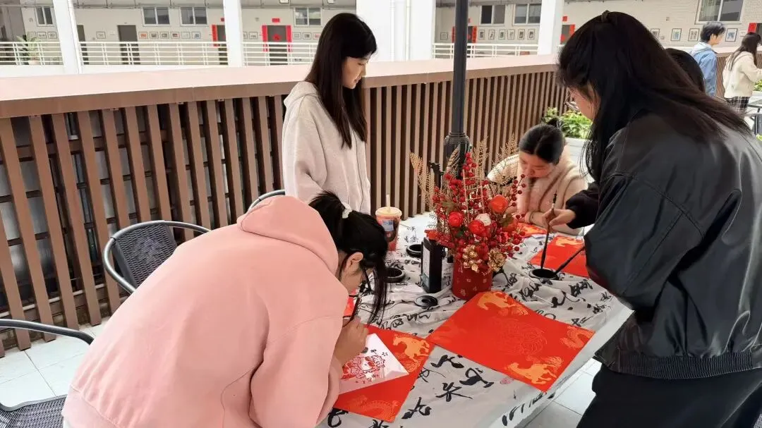 在“墨韵迎春”书法体验区,同学们执笔挥毫,笔墨与宣纸相遇,一个个福字、一副副春联跃然纸上。笔锋流转间,不仅是传统文化的传承,更写下了对自己、对同窗的新春期盼。