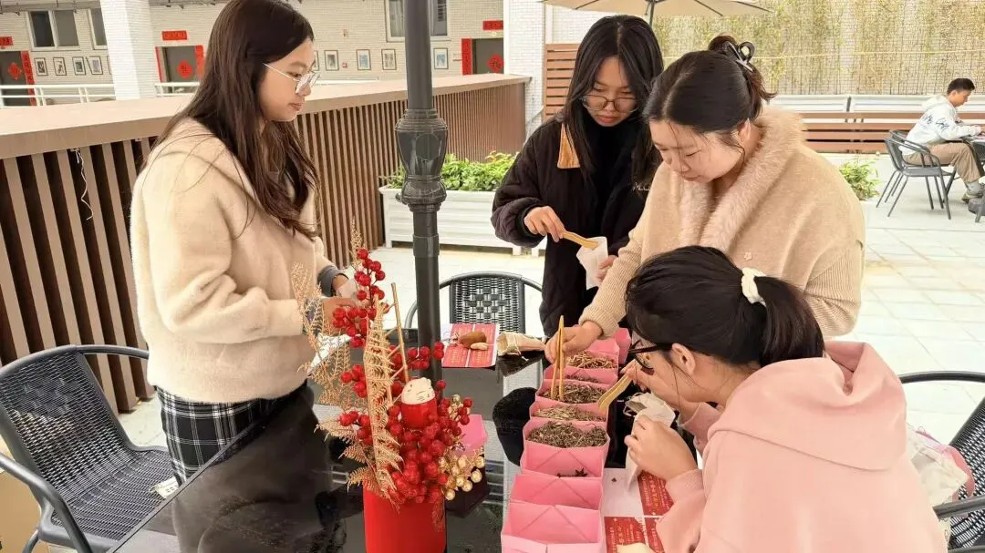 最受大家喜爱的莫过于“巧手纳福”香囊制作区。桌上铺满了各式布料、艾草、丁香等香料。同学们细心挑选、装填、缝合,互相交流着技巧。指尖翻飞中,一个个精巧别致、香气馥郁的香囊逐渐成型。这亲手制作的不仅是节日饰品,更是一份安神祈福的美好心意,承载着对健康平安的马年祝愿。