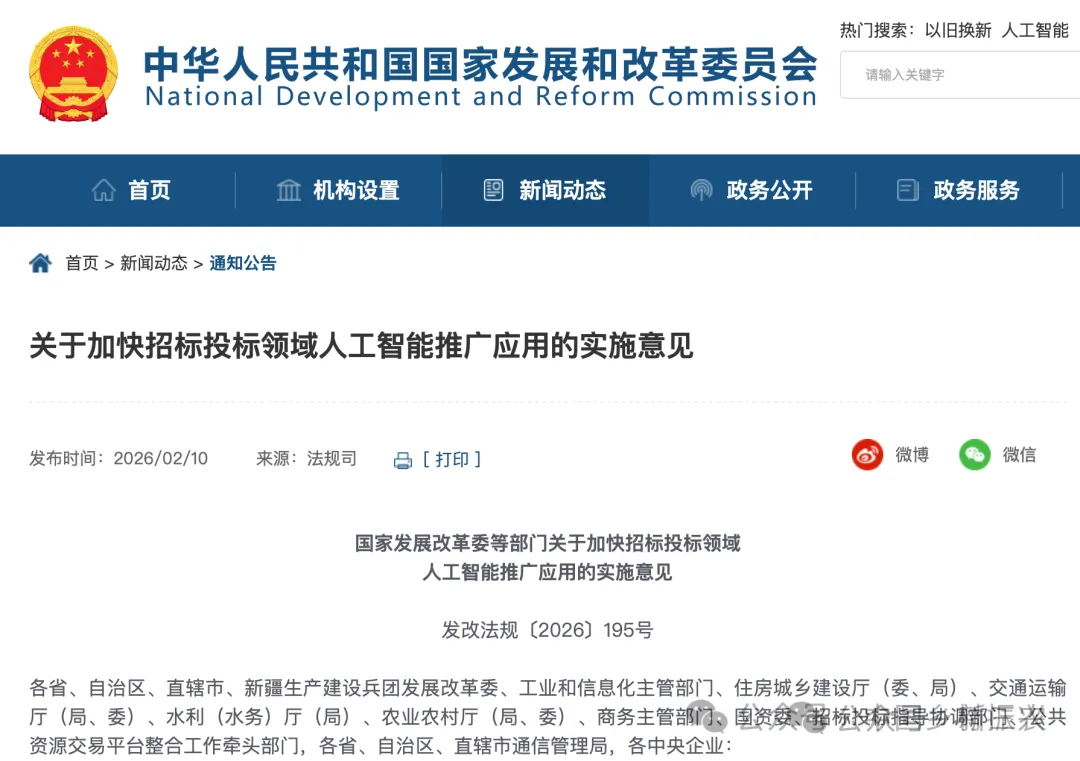 各省、自治区、直辖市、新疆生产建设兵团发展改革委、工业和信息化主管部门、住房城乡建设厅(委、局)、交通运输厅(局、委)、水利(水务)厅(局)、农业农村厅(局、委)、商务主管部门、国资委、招标投标指导协调部门、公共资源交易平台整合工作牵头部门,各省、自治区、直辖市通信管理局,各中央企业:为贯彻落实党中央、国务院关于深化招标投标改革部署要求,按照《国务院关于深入实施“人工智能+”行动的意见》有关安排,推动招标投标和人工智能深度融合、促进招标投标市场规范健康发展,现提出如下意见。围绕招标投标交易全过程和管理重点环节,按照政府引导、多方参与、场景牵引、安全可控的原则,积极稳妥推进人工智能在招标投标领域的应用,改进招标投标范式,提升服务和监管的数智化水平,为保障公共资源公平高效配置、规范招标投标市场秩序提供有力支撑。2026年底,招标文件检测、智能辅助评标、围串标识别等重点场景在部分省市实现全覆盖应用;2027年底,更多重点场景在全国范围内推广应用,形成一批模型训练、场景应用、机制保障等方面的经验做法,有效促进招标投标市场规范健康发展。1.招标策划。辅助招标人对行业趋势、市场供需、资源要素等进行综合研判,准确理解、分析有关项目的投资审批、招标投标、履约验收等信息,生成客观量化的招标需求、技术和商务条件,从源头提高招标的科学合理性。2.招标文件编制。在深度理解项目目标、建设内容、招标需求、技术和商务条件等基础上,结合历史交易情况和政策法规要求,智能匹配招标文件范本,推荐适合的资格条件、评标办法和评标标准,辅助招标人编制或自动生成招标文件,提升招标文件的编制质量。3.招标文件检测。结合有关政策法规要求,对招标文件开展合规性、合理性、错敏词等多维度检测,自动识别各类违法违规和排斥限制竞争等问题,提示判断依据和修改建议,辅助招标人对招标文件进行智慧纠偏。鼓励实行招标文件“先体检、再发布”。4.投标策划。全方位捕捉各类项目招标信息,结合投标人特点推送适合的项目信息,自动提取并解析项目招标计划、招标公告和招标文件等资料中的关键要素,智能生成招标需求图谱,对重要内容进行提示。结合历史交易和同类项目等情况,辅助分析评估参与项目竞争的经济性,提高投标效率。5.投标合规自查。深度解析项目招标需求和招标文件要求,结合投标人的特点和优势,辅助投标人确定技术方案和报价区间。对投标人编制的投标文件,对照招标文件进行响应性比对,自动提示投标文件中的违法违规、错误缺漏等问题,辅助投标人针对性修改完善。对可能低于成本价的投标进行风险提示,减少恶意低价竞标等情况。6.开标。打造类人化的数字开标人,调度项目开标活动全流程,自动完成宣读开标纪律、公布投标人名单、标书解密、唱标、结果确认等工作。智能判断开标异常情况并进行提示,辅助招标人实时高效处理。7.专家抽取。综合解析项目特点和评标要点,根据评标专家的专业分类、地域分布、回避规则等条件,结合远程异地评标等要求,自动生成与项目相适应的专家抽取方案,提高所抽取专家与项目的匹配度,保障专家抽取的科学性和公正性。8.智能辅助评标。打造类人化的评审推理能力,掌握不同专业评标专家的知识结构体系,按照项目类型建立综合评审指标体系,结合具体项目推荐或匹配评审点,全面提取招标投标文件要素,深度解析招标文件内容和投标文件响应度,辅助专家开展评审或生成结果供专家参考,提升评标的公正性。9.评标报告核验。打造评标报告智能审核能力,辅助招标人核查评标报告的数据准确性、逻辑关联性、内容合规性等,自动预警客观评审因素评分不一致、分值计算错误、专家打分偏离度过大等问题,提示评标专家进行复核确认并修改完善。10.辅助定标决策。基于招标需求、供应链管理、历史交易情况等,结合有关行业、信用、税务、司法等平台系统数据,对中标候选人进行多维立体画像。引入数字人答辩等方式,辅助招标人对中标候选人进行综合比对分析并作出定标决策,实现定标全过程记录和可追溯。11.中标合同签订。在招标投标文件资料中自动提取中标合同的主要签约要素,参考有关示范文本并结合项目专用合同条款生成合同,实现合同的在线签订和存档。结合政策法规要求、历史交易情况等,对中标合同的关键权利义务条款进行风险提示,减少“阴阳合同”、随意篡改等问题。12.场所调度。对交易场所进行全方位智能化管理,高效调配场所工位资源和人员力量,动态监测交易场所中的各类人员和活动情况,提高交易设施的智能化水平,打造无人值守的智慧交易环境。加强交易场所之间的协同联动和资源互补,提升跨区域交易服务的便利化水平。13.见证管理。构建“智能研判—动态干预—链上存证”的闭环见证体系,对招标投标交易各环节进行无感化数字见证,全面、准确记录交易全过程。强化异常行为分析预警,对涉嫌违法违规活动及时提醒劝阻,加强问题线索报告,为有关部门执纪执法提供支撑。14.档案管理。构建招标投标交易档案智能化管理体系,结合智能见证管理实现交易文件的智能填报、交易数据的链上存证。对招标投标交易资料进行智能命名与归类,自动生成档案索引