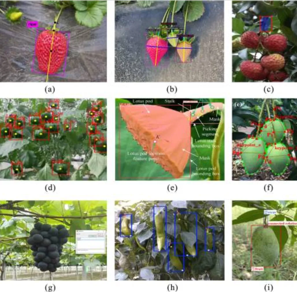 图为一种不同水果采摘点的贴标方法。(a)草莓采摘点计算、(b)草莓采摘点计算、(c)荔枝采摘点计算、(d)甜椒采摘点、(e)荚蒾采摘点计算、(f)芒果采摘点计算、(g)葡萄采摘点计算、(h)辣椒采摘点计算、(i)芒果采摘点计算;来源PubMed Central 《面向智能水果采摘机器人的视觉感知技术综述》