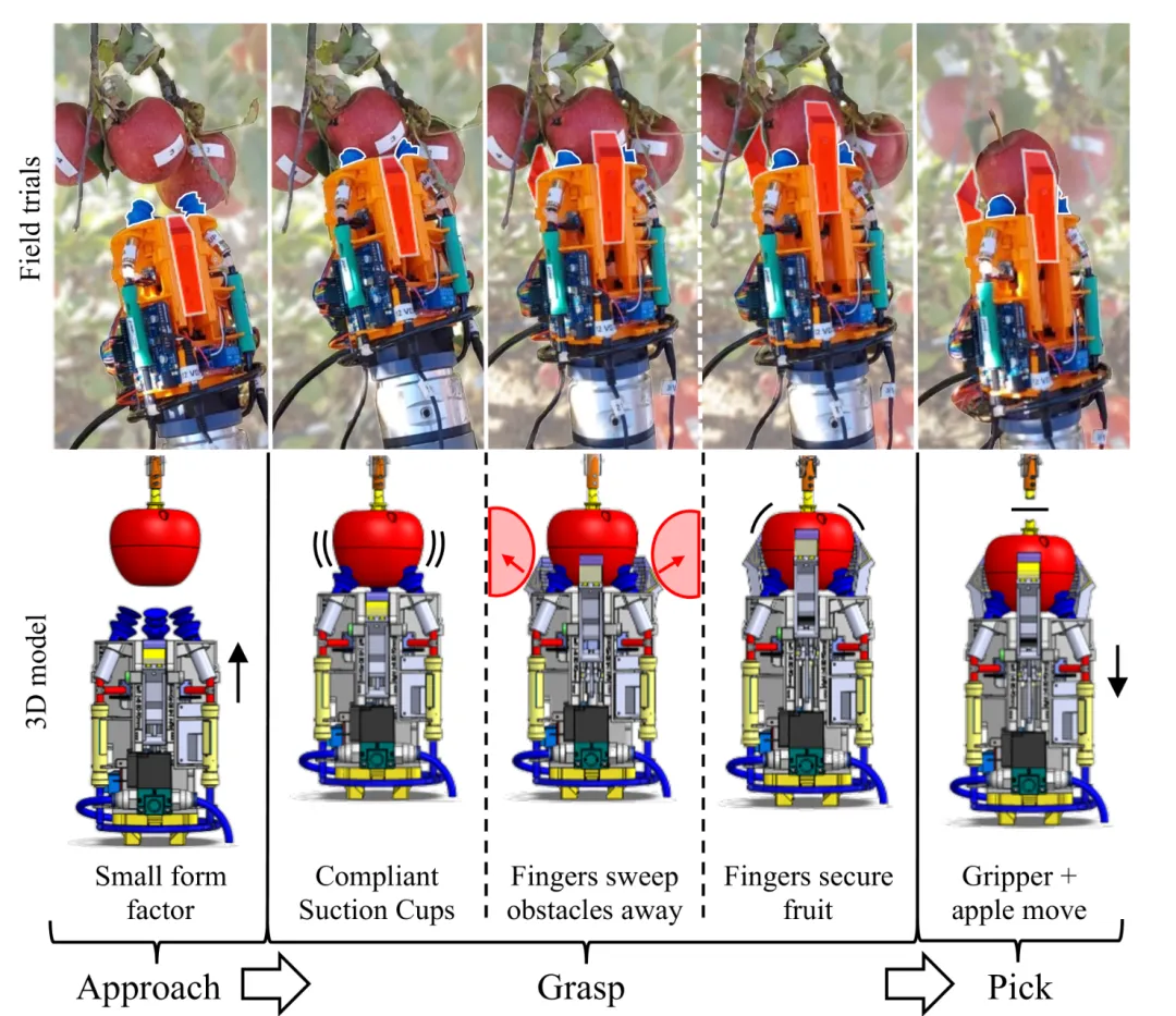 图片来源康奈尔大学《紧凑型机器人夹持器,带串联驱动,用于选择性水果收获》;从左到右。方法:夹持器以小尺寸接近水果,以减少碰撞。抓握:最初用吸盘顺从抓握,然后用凸轮驱动的手指抓握,夹在相邻的水果之间。采摘:在采摘过程中,苹果被固定在夹持器中。