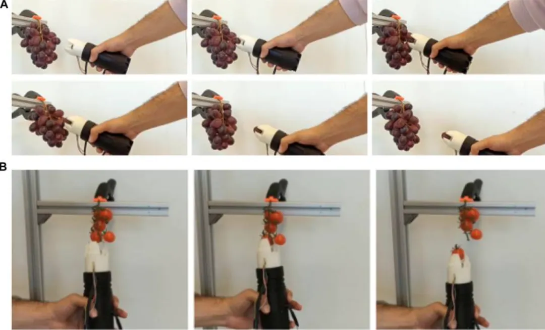 图片为采用热塑弹性体(TPE)适合小型水果的软夹持器与评估设计的夹持器,用作采摘(A)葡萄和(B)樱桃番茄等簇状水果的软工具。图片来源PubMed Central 《软夹持器,用于小水果收获和拾取和放置作》