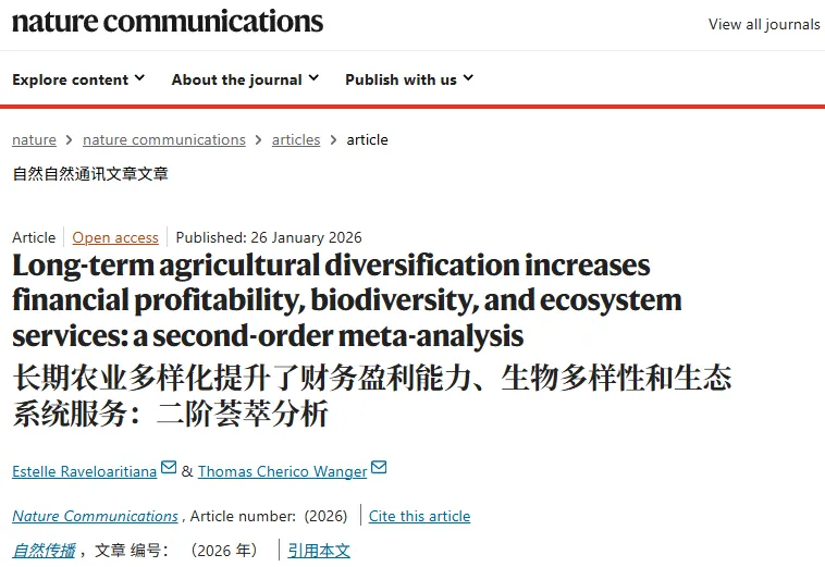 Raveloaritiana, E., Wanger, T.C. Long-term agricultural diversification increases financial profitability, biodiversity, and ecosystem services: a second-order meta-analysis. Nat Commun (2026). https://doi.org/10.1038/s41467-025-67757-7