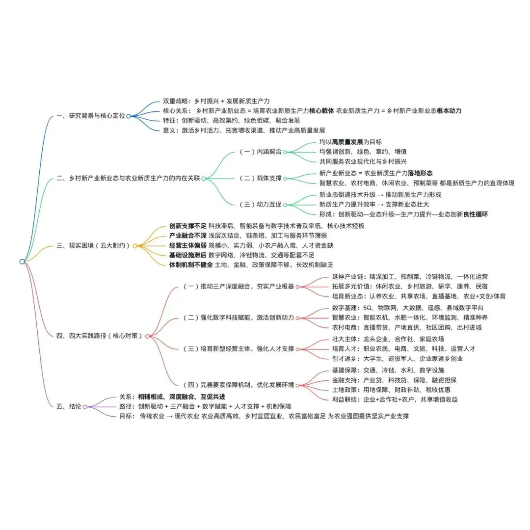 健全制度体系为农业新质生产力保驾护航。一是强化基础设施保障,加大农村交通、冷链、水利、数字设施投入,补齐新业态发展硬件短板。二是创新金融支持模式,推出乡村产业贷、科技贷、保险产品,解决新业态融资难、融资贵问题。三是优化土地与政策支持,保障新业态发展用地需求,完善财政补贴、税收优惠政策,向新产业新业态与科技创新领域倾斜。四是健全利益联结机制,推广“企业+合作社+农户”模式,让小农户共享产业增值收益,夯实农业新质生产力的群众基础。