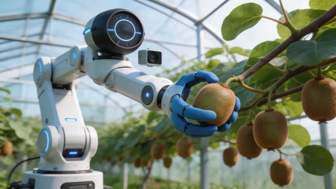 更狠的是农业机器人。在杭州富阳的猕猴桃大棚里,智能采摘机器人伸出软爪,轻轻抓住猕猴桃,前后摇摆,把果子从藤上“掰”下来——整个过程不到3秒。