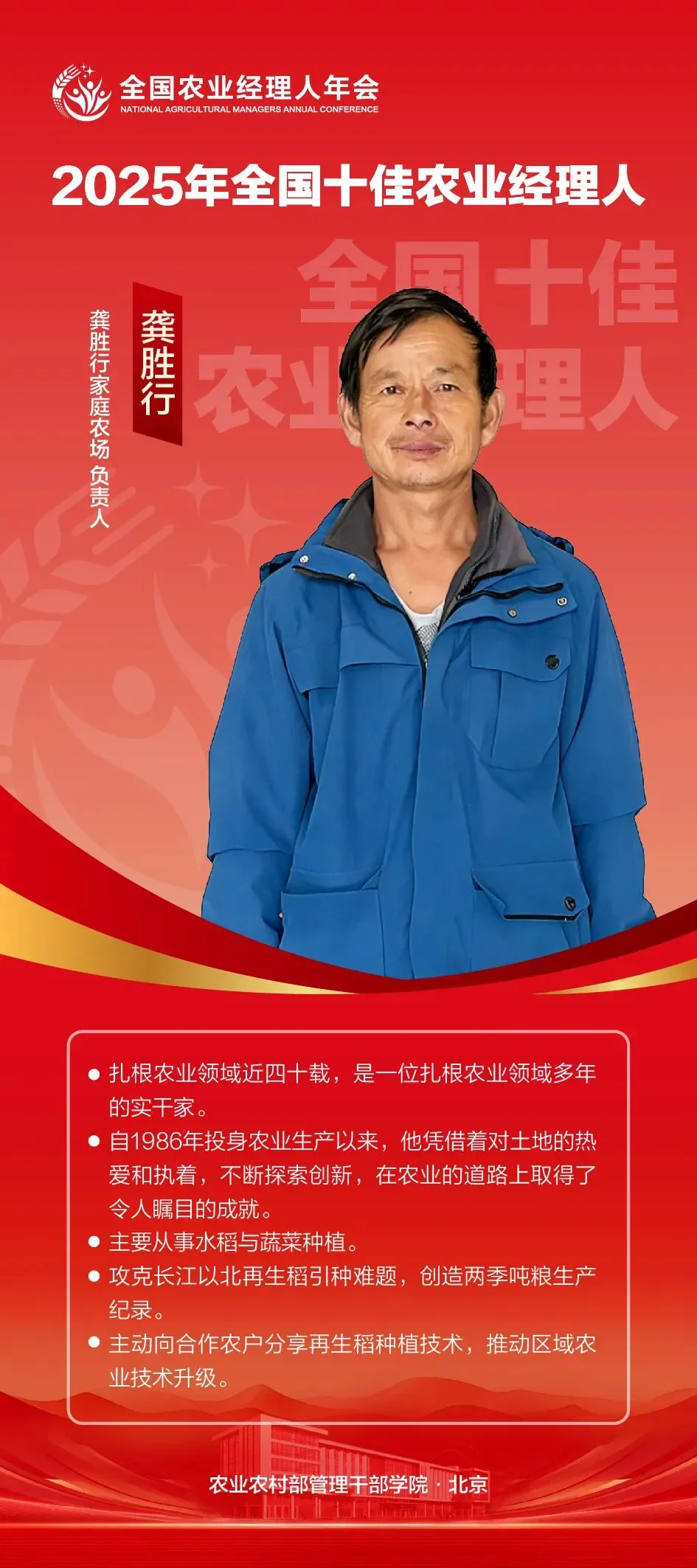 借着国家乡村振兴战略的政策东风,龚胜行主动对接农业农村部干部管理学院、南京农业大学等多所高校及科研机构,参加专业技术培训,持续提升自身能力。2018年起,他潜心开展再生稻引种试验,历经多年攻坚,至2024年形成成熟种植技术,再生季亩产超500斤,两季总产量近吨粮,实现重大技术突破。
