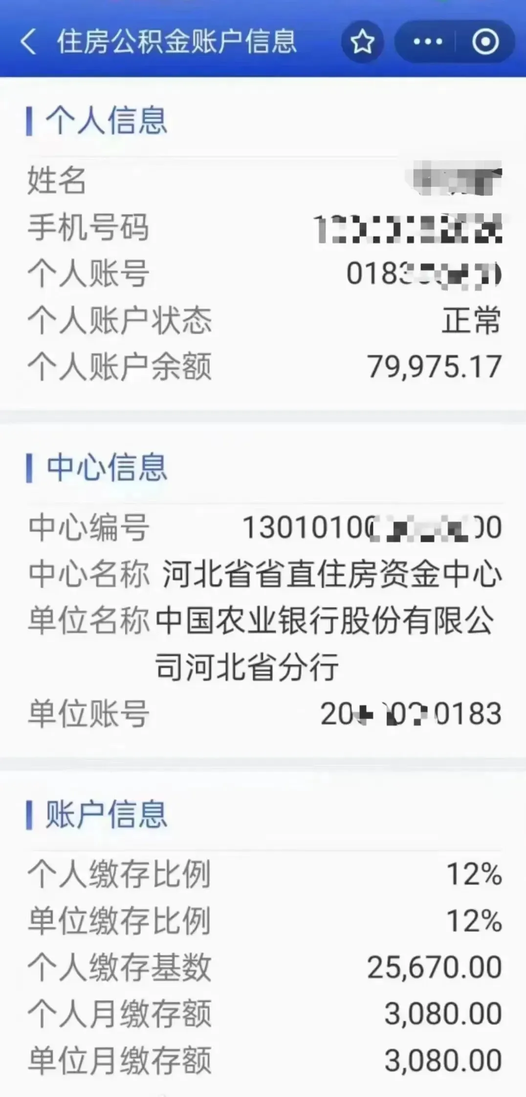 一网友晒贴,坐标河北,农业银行,晒了自己的公积金缴存情况,每个月缴存的额是3080元,双边合计一起6160元。