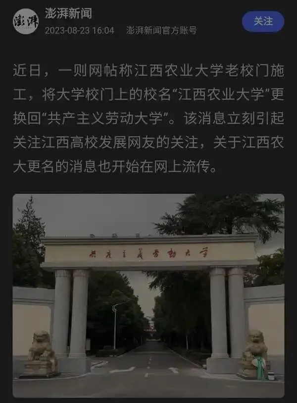 此校名是 江西农业大学 的曾用名,八十年代才改的,先前校内因在校门上复原了 共产主义劳动大学 字样,还被媒体关注过是否打算更改校名。