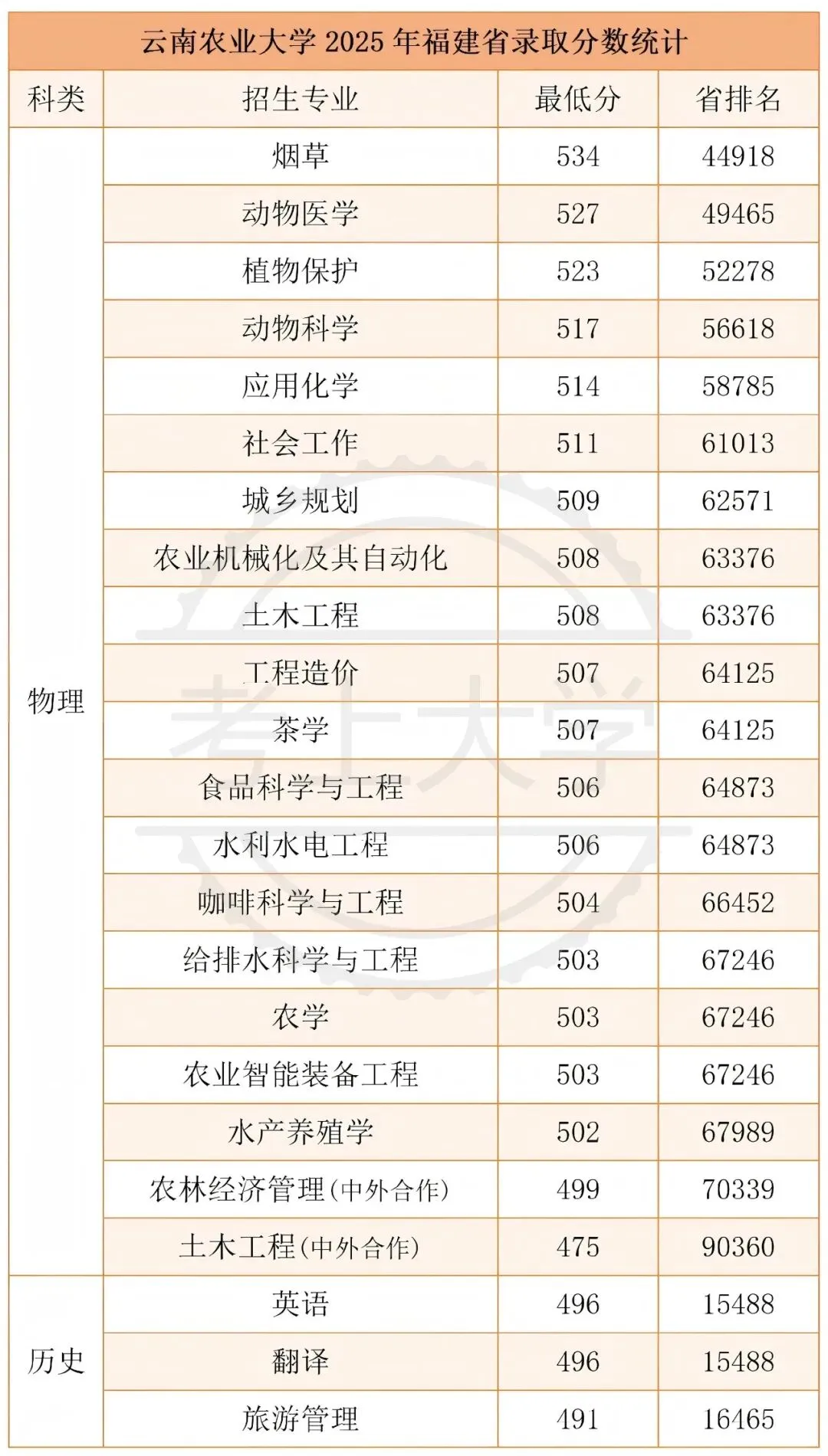云南农业大学2025年在福建省招生类型主要是普通类本科批,其中物理组录取最低分475,省排名90360;历史组录取最低分491,省排名16465。